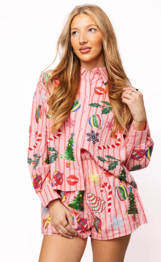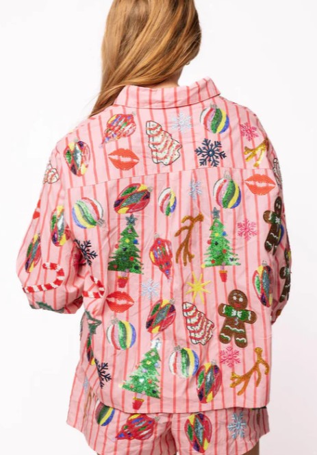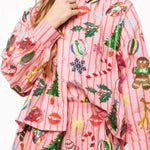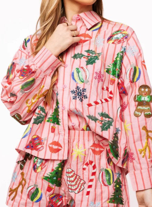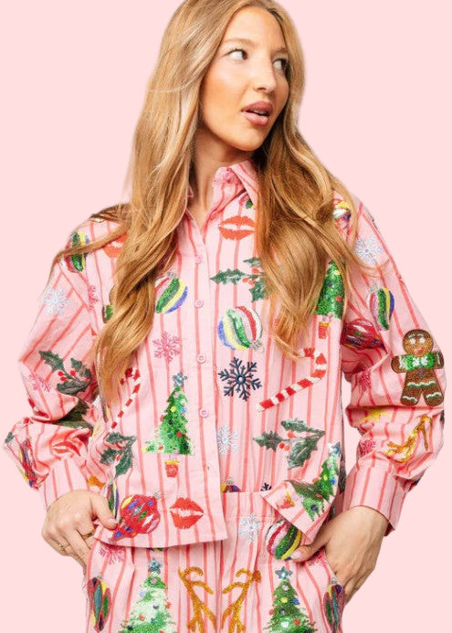 This light pink button-up top features vibrant red stripes and playful sequin Christmas icons scattered all over, adding a festive sparkle to your holiday wardrobe. Perfect for cozy gatherings or seasonal fun, it pairs effortlessly with matching shorts or pants for a complete, cheerful look. Celebrate in style and comfort with this merry and bright design!