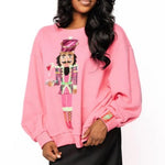 Get ready to shine at your holiday party in this hot pink oversized sweatshirt, featuring a quirky nutcracker serving a cosmopolitan. Comfortable and eye-catching, it’s the perfect playful piece to bring festive fun and vibrant style to any celebration.