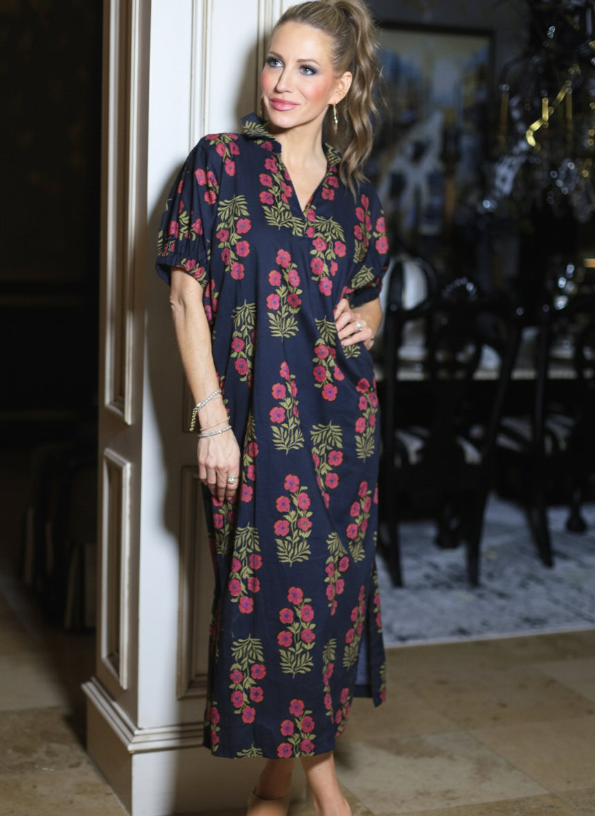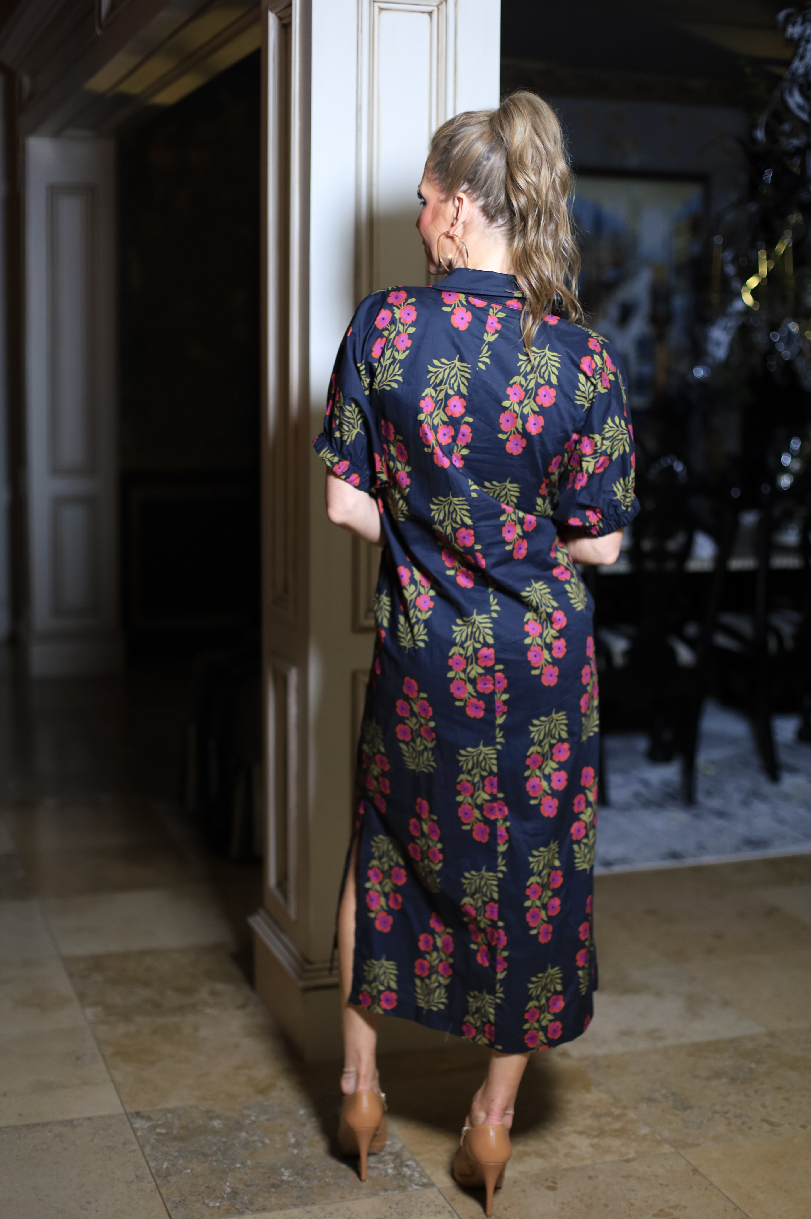 Make a graceful statement in our LOOK MY WAY FLORAL NAVY MIDI DRESS , where botanical florals meet polished design. The structured V-collar and delicate puff sleeves create a refined silhouette, while strategically placed side slits offer subtle movement and modern appeal. Fully lined for a luxurious feel, this piece transitions seamlessly from professional settings to social occasions with understated sophistication.