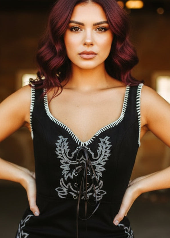 Turn heads at the rodeo in this RODEO DARLING BLACK EMBROIDERED FAUX SUEDE DRESS featuring bold silver Western embroidery across the bust, sides, and hem. The plunging V-neckline showcases ivory whipstitching for authentic frontier flair, while the adjustable lace-up corset front provides custom shaping and support. A full back zipper ensures a sleek, flattering silhouette. Pair with turquoise statement jewelry and cowgirl boots for the ultimate Western-inspired look.