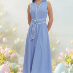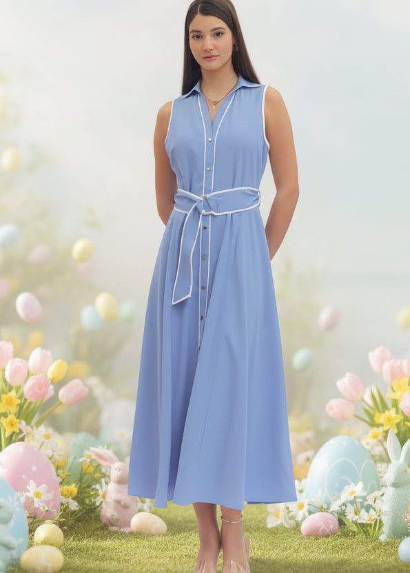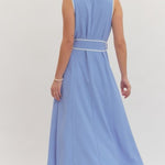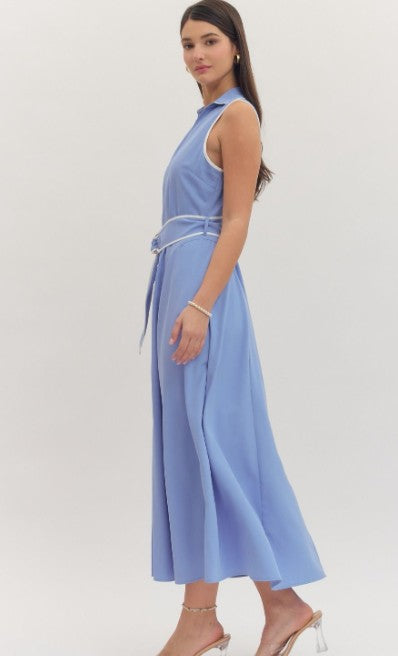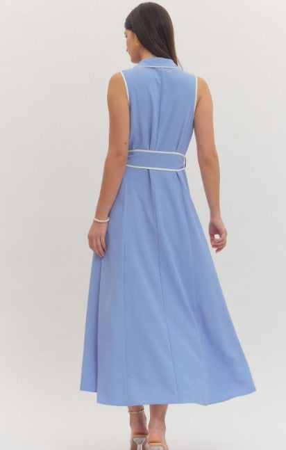 Effortless elegance meets everyday versatility in this SWEET INTENTIONS BLUE MIDI DRESS. The sleeveless silhouette features sophisticated contrast binding that adds visual interest, while the removable self-tie belt lets you customize your look. A front button closure and full lining ensure comfort and practicality. Crafted from quality woven fabric, this dress transitions seamlessly from casual outings to dressed-up occasions.
