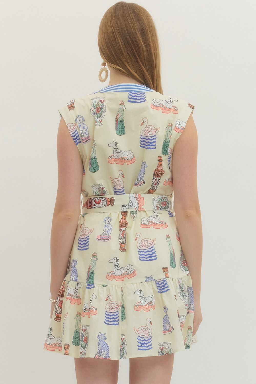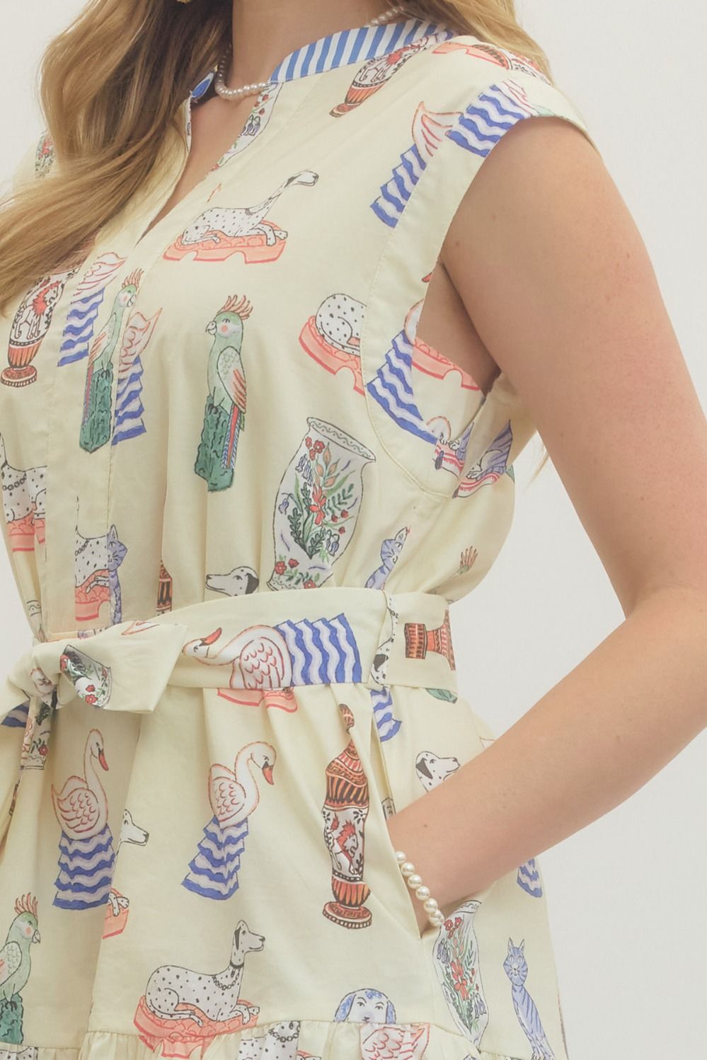 Calling all animal enthusiasts! Our ANIMAL LOVER IVORY PRINT DRESS celebrates your love for wildlife with playful animal prints throughout. The flattering split V-neck with contrast stripe binding adds a modern touch, while the self-tie belt cinches your waist for a custom fit. Practical side pockets keep your essentials close, and the lightweight, lined woven fabric ensures comfort all day long. Perfect for anyone who wants to wear their passion for animals with style and personality.