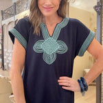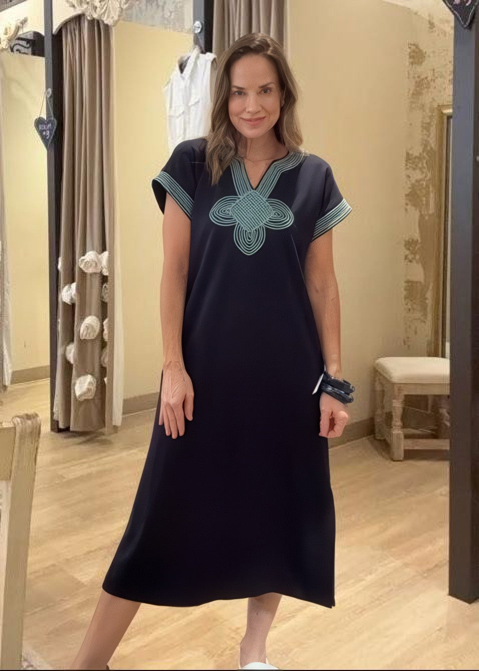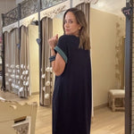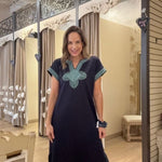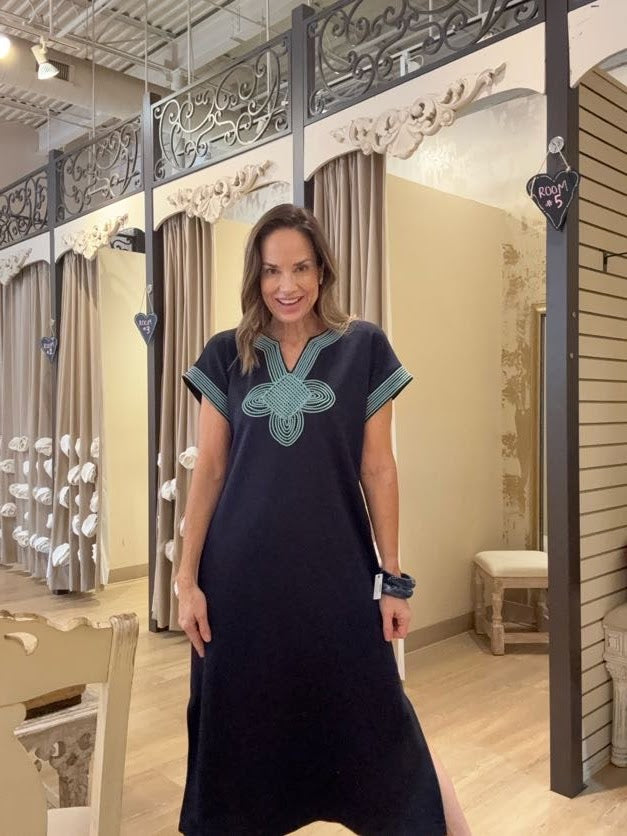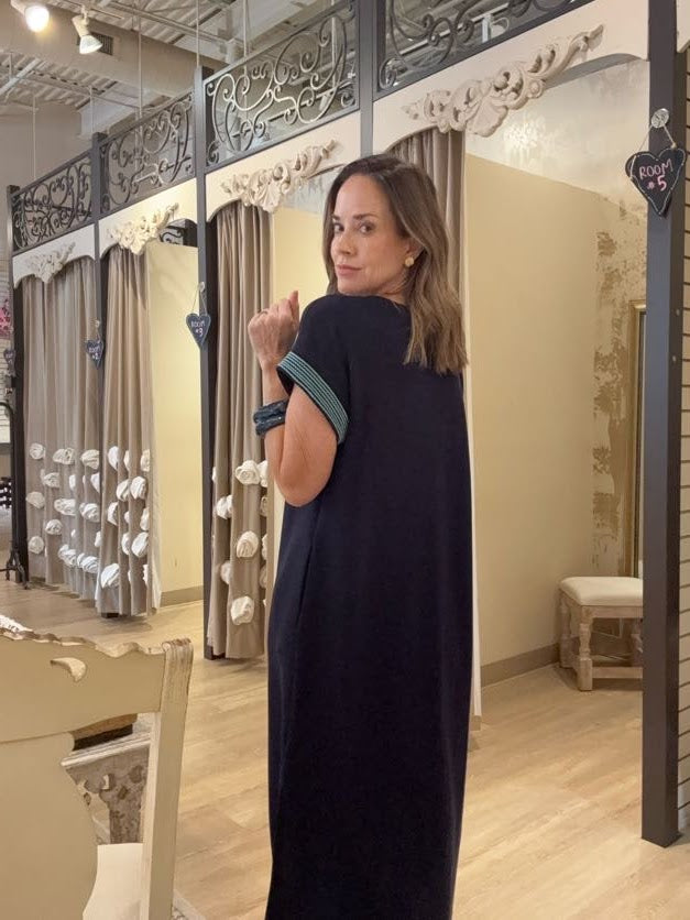 Effortlessly elegant, this SUNSET SAIL NAVY MAXI DRESS features short sleeves and striking contrast embroidery that catches the light beautifully. Practical side slits allow for easy movement, while hidden pockets add everyday functionality. Perfect for sunset strolls or casual evening gatherings, this versatile piece transitions seamlessly from day to night.