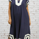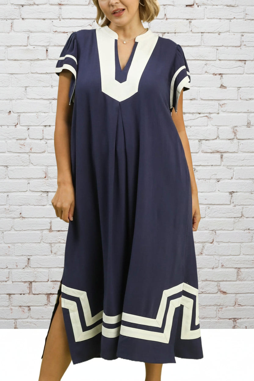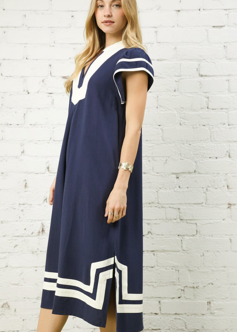 Effortlessly chic and undeniably comfortable, our MEANT FOR THIS NAVY MAXI DRESS is your go-to for warm-weather days. The cream contrast striping adds a playful touch, while the relaxed A-line silhouette flatters every frame. Cap sleeves with trim detail and a wide neckline keep things breezy, and convenient side slits make movement a breeze. Unlined for that light, airy feel you'll love all season long.