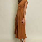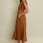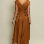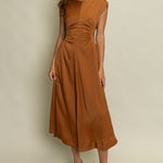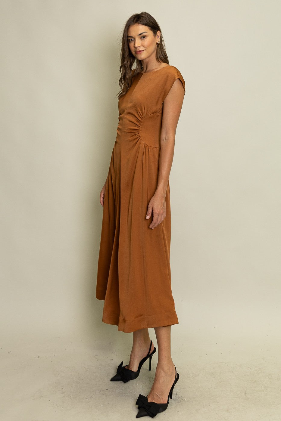 Elegant and effortlessly flattering, this POLISHED PERFECTION SATIN PANEL MIDI DRESS features delicate cap sleeves and strategic ruched detailing at the waist for a beautiful drape. The subtle sheen and flowy silhouette make it a standout piece for special occasions or evening events. Finished with a back zipper and soft lining for all-day comfort. A must-have dress that blends timeless femininity with modern polish.