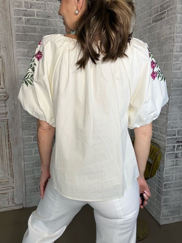 Embrace the season with this charming DREAMY DESIGNS EMBROIDERED BLOUSE, perfect for spring days ahead. Crafted from soft cotton with a delicate lined construction, it features a flattering V-neckline and playful short bubble sleeves that add a touch of whimsy. The intricate embroidered details bring dreamy, romantic flair to any casual or dressed-up look. Comfortable, breathable, and effortlessly stylish—your new spring essential.