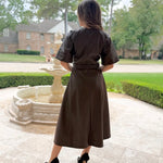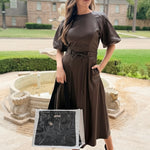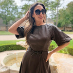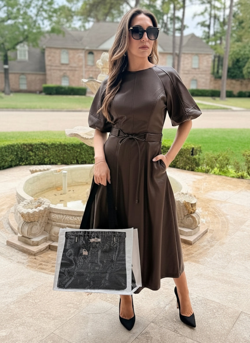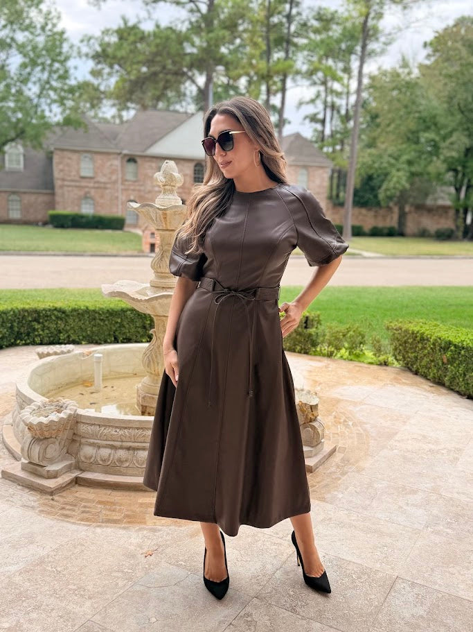 Make a statement in this stunning CHIC AFFAIR CHOCOLATE FAUX LEATHER MIDI DRESS—a timeless essential that works as hard as you do. The elegant raglan puff sleeves and classic round neckline offer refined sophistication, while the removable quilted belt gives you styling flexibility for any occasion. Thoughtfully designed with side pockets for practicality, a hidden zipper for a seamless look, and full lining for all-day comfort, this versatile dress is the wardrobe staple you'll reach for again and again.