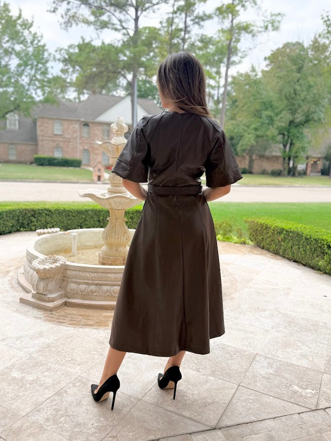 CHIC AFFAIR CHOCOLATE FAUX LEATHER MIDI DRESS