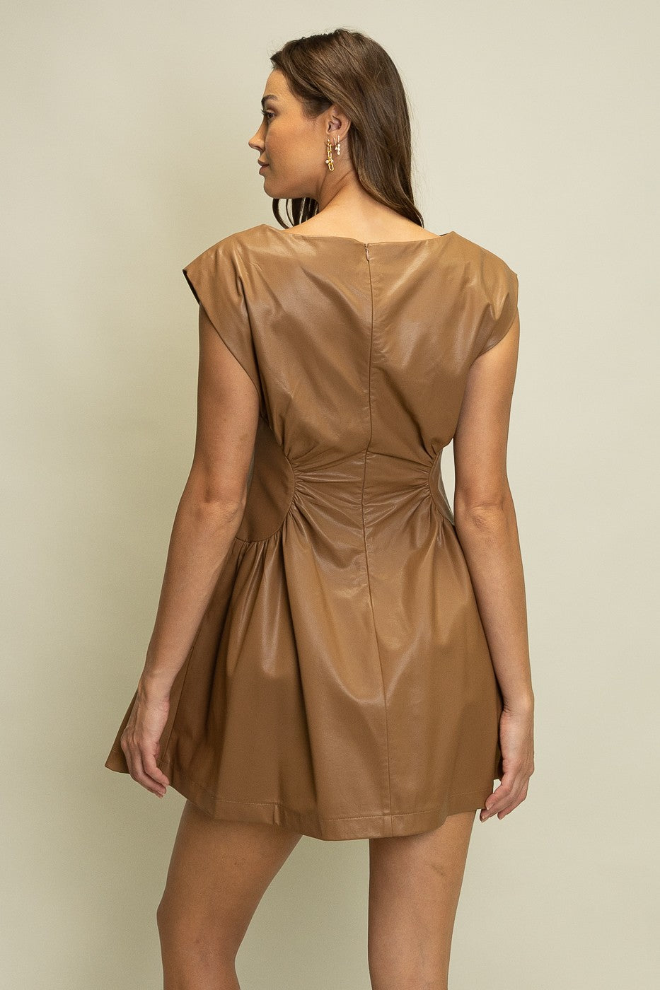 Turn heads in this bold SLEEK UPTOWN FAUX LEATHER MINI DRESS with a sharp shoulder silhouette and ruched waist that flatters your curves. Its sleek, structured design adds a modern twist, making it perfect for pairing with standout boots or layering with chic outerwear. Ideal for those who love to rock a confident, fashion-savvy vibe with a playful edge.