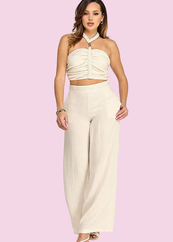 Make a splash this season with our COASTAL CRUSH HALTER TOP AND PANT SET! This dynamic duo pairs a chic halter top with matching pants, both featuring eye-catching rope detailing that adds texture and personality. Perfect for beach getaways, resort wear, or turning heads at your next vacation. Embrace your inner coastal goddess with this fun, flirty set that's ready for adventure.