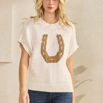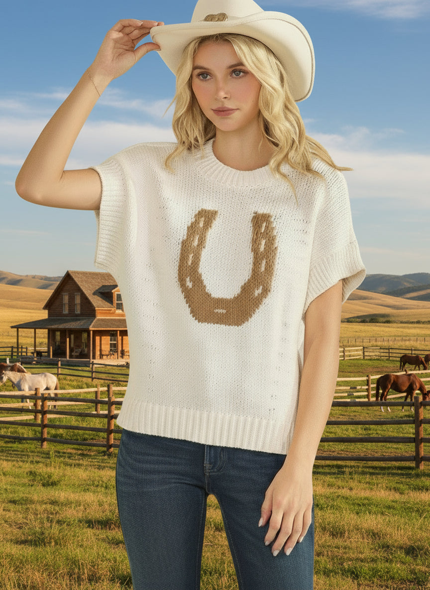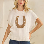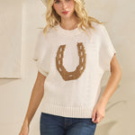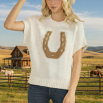 THE DUCHESS IVORY HORSESHOE SWEATER is a chic blend of comfort and style. Made with a cozy cotton blend, this knit sweater is designed to keep you warm. The unique horseshoe design adds a touch of Western flair, perfect for those who love to express their individuality. This sweater moves with you, offering style and confidence.
