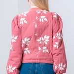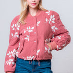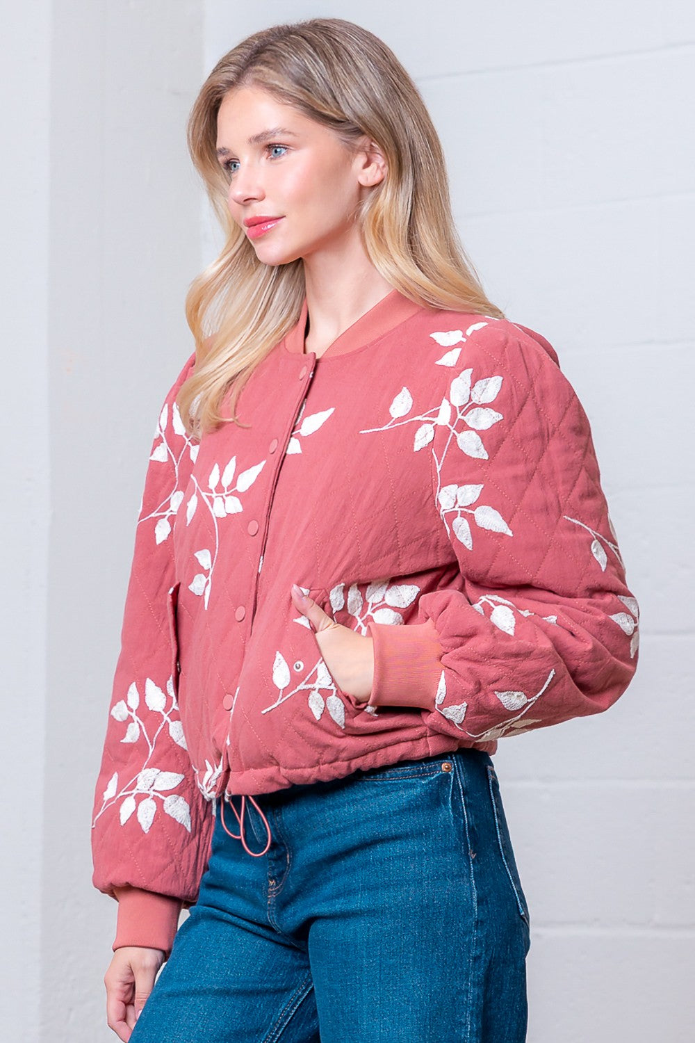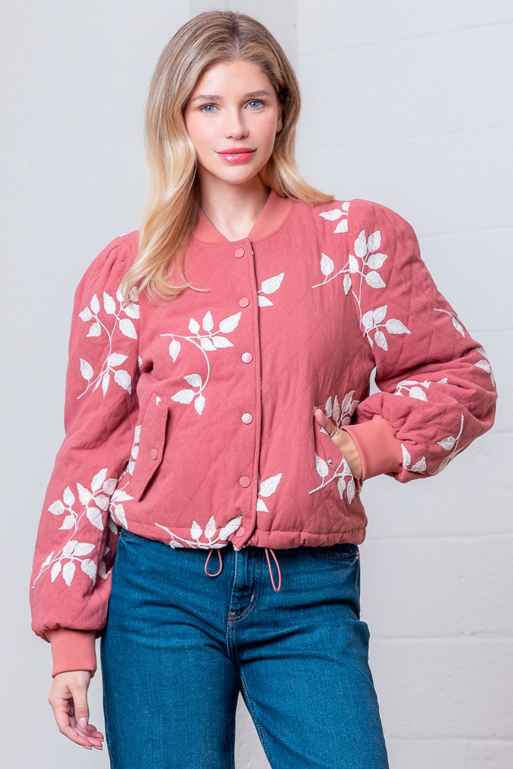 Cozy up in this terracotta CABIN COZY EMBROIDERD QUILTED JACKET, decked out with charming leaf embroidery. Featuring a snap-down front, long sleeves, a collared neckline, and a relaxed fit, it’s perfect for adding a playful touch to your casual look.