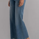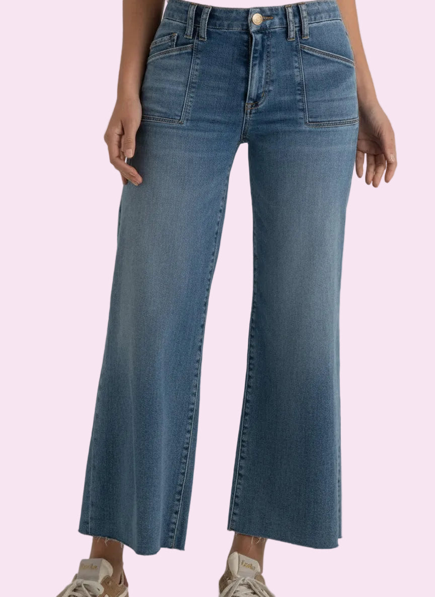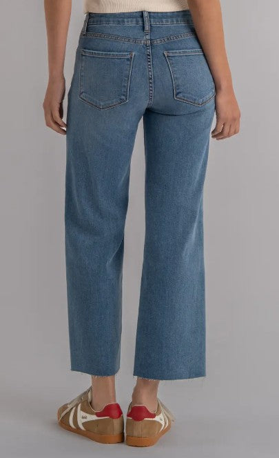 Upgrade your denim with these KUT MEG HIGH RISE WIDE LEG JEANS in a timeless medium wash. Featuring clean front inset pockets, a cool raw hem, and soft, stretchy fabric, they blend laid-back edge with all-day comfort—perfect for effortless, everyday style.