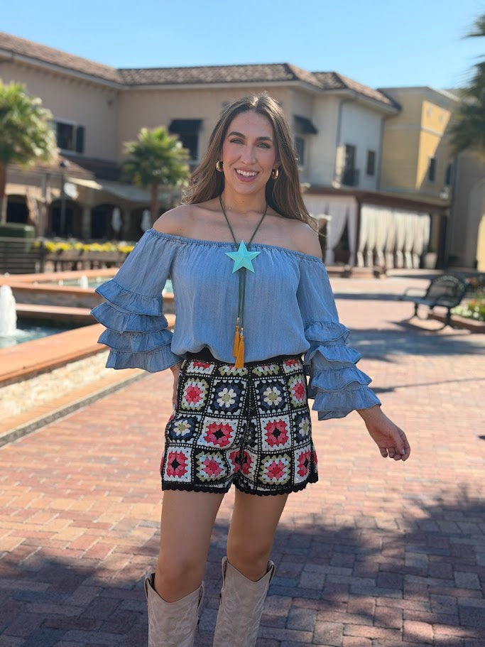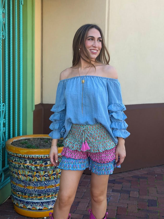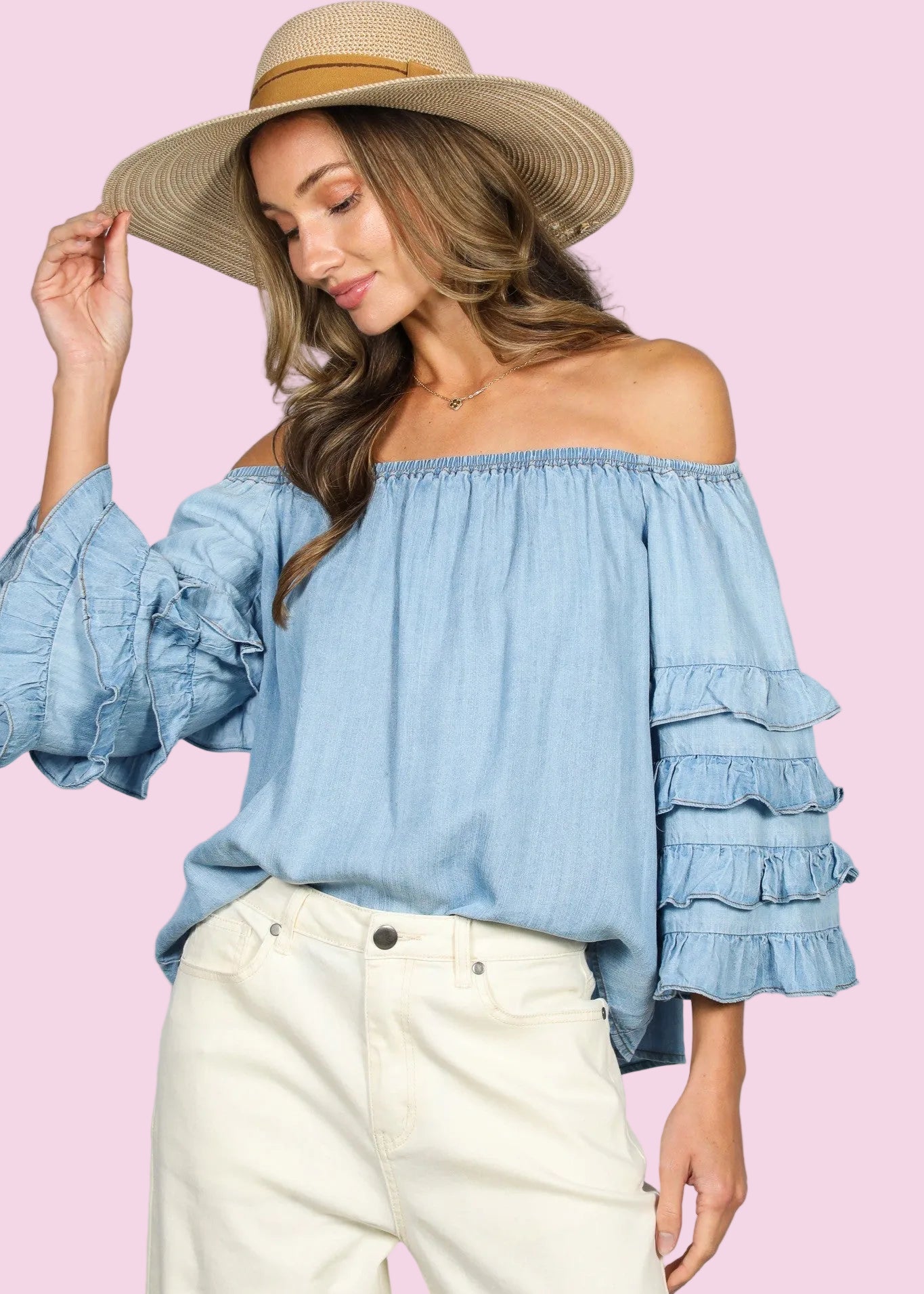 Effortlessly chic and undeniably charming, this SWEET TALKER OFF THE SHOULDER CHAMBRAY TOP combines classic denim styling with playful ruffled sleeves. The relaxed neckline creates a breezy, romantic silhouette perfect for casual outings or dressed-up occasions. Soft chambray fabric offers breathable comfort while the delicate ruffle details add movement and personality to your everyday wardrobe.
