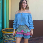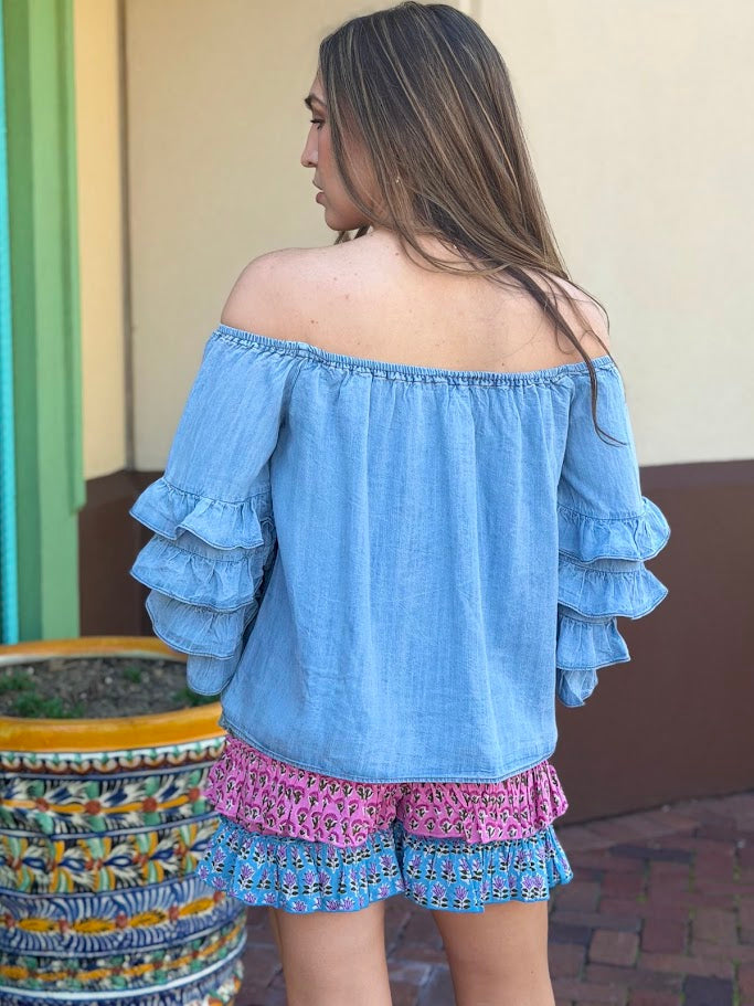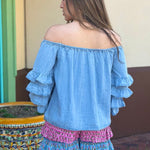 SWEET TALKER OFF THE SHOULDER CHAMBRAY TOP