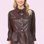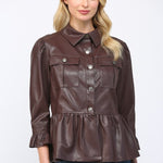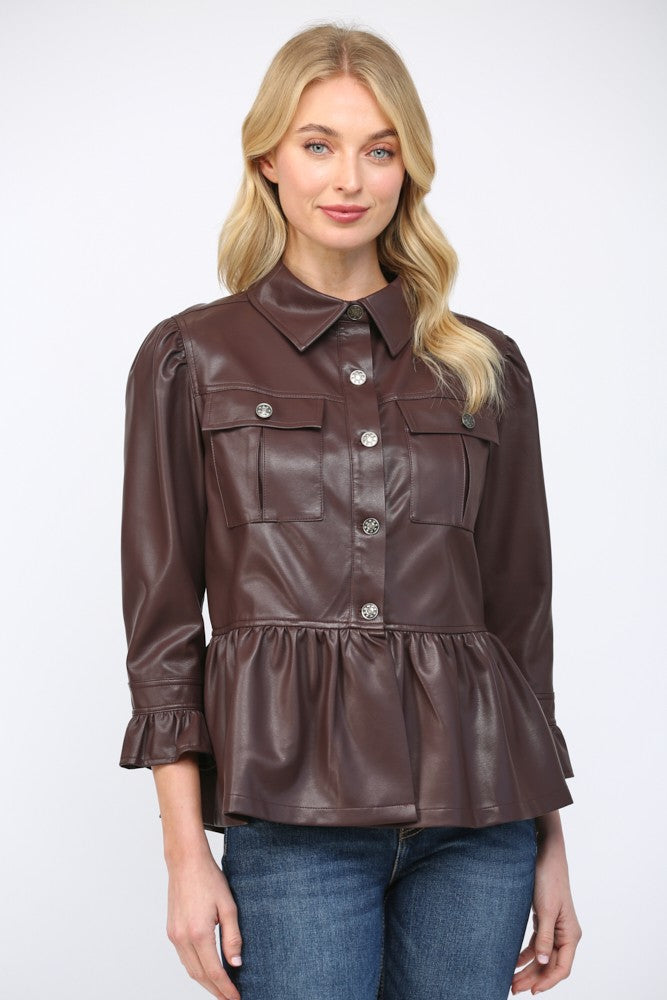 Rock a fun, flirty vibe with this BUBBLY PERSONALITY PEPLUM FAUX LEATHER TOP! The structured 3/4 sleeves and playful peplum hem create instant personality and movement. Perfect for adding edge to your everyday look or dressing up for a night out. This faux leather piece gives you that bold, confident style without the commitment.