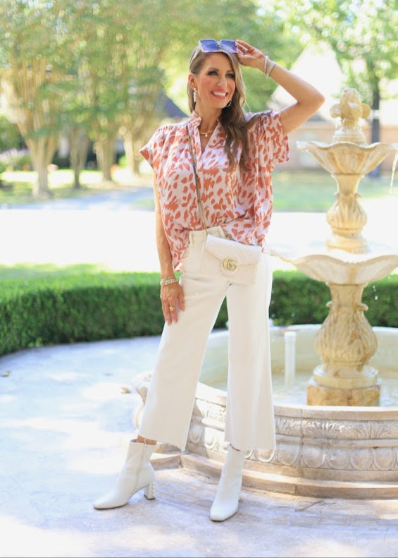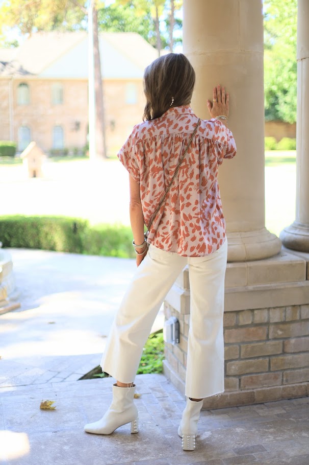 The AUTUMN STROLL PRINT BLOUSE features a V-neck, dropped shoulders, and a relaxed fit with charming placket shirring for a breezy, fun look.