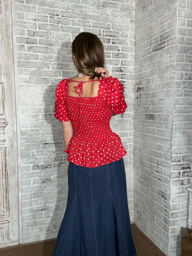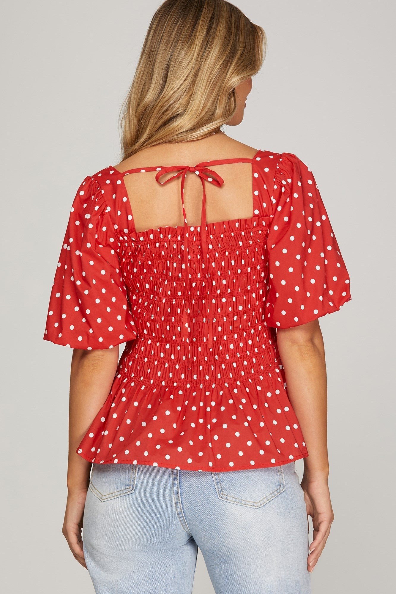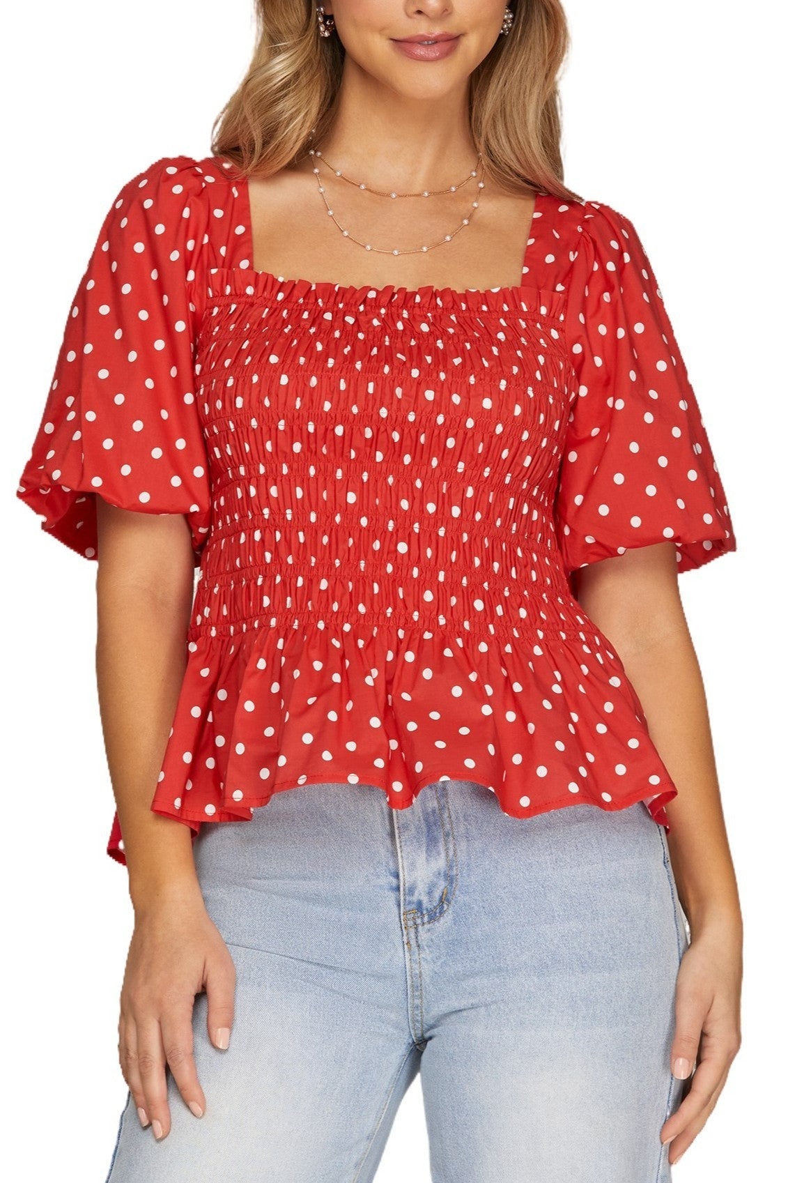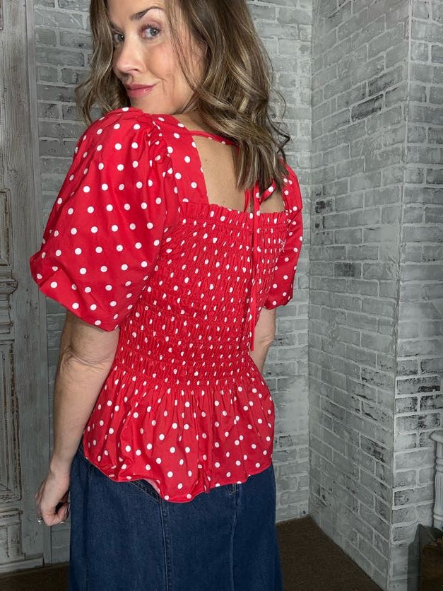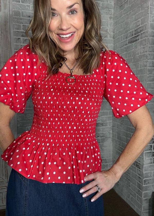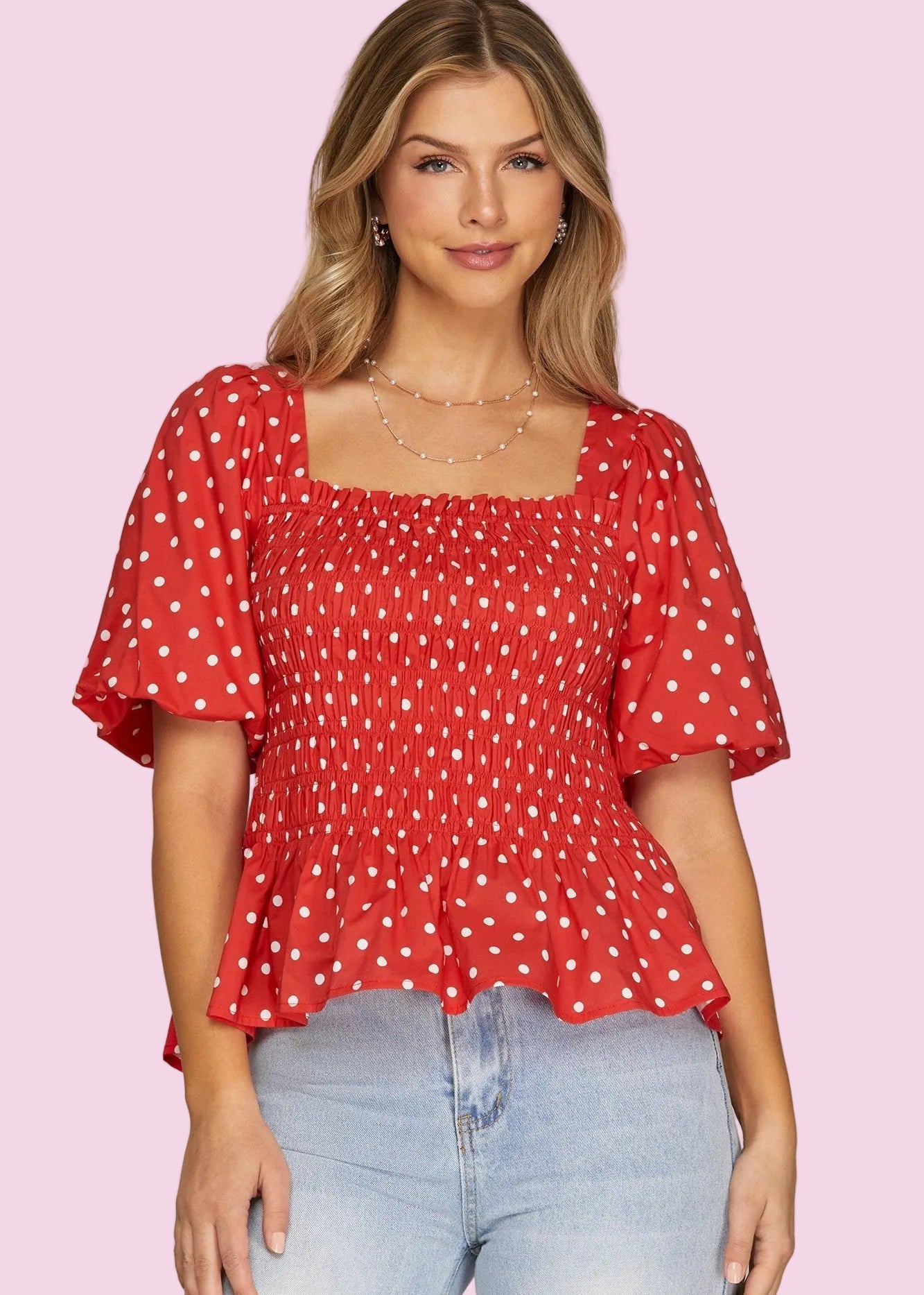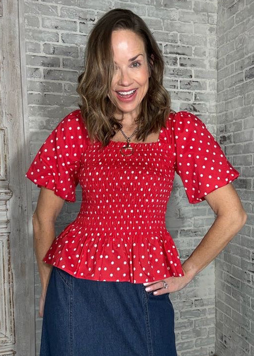 Twirl into sunshine with this vibrant DANCING IN THE SUN RED POLKA DOT PEPLUM TOP! Featuring a charming smocked bodice and playful puff half sleeves, this woven beauty adds instant fun to any wardrobe. The fitted smocking detail flatters your silhouette while the flirty peplum hem keeps things light and breezy. Perfect for dancing through your day in style.