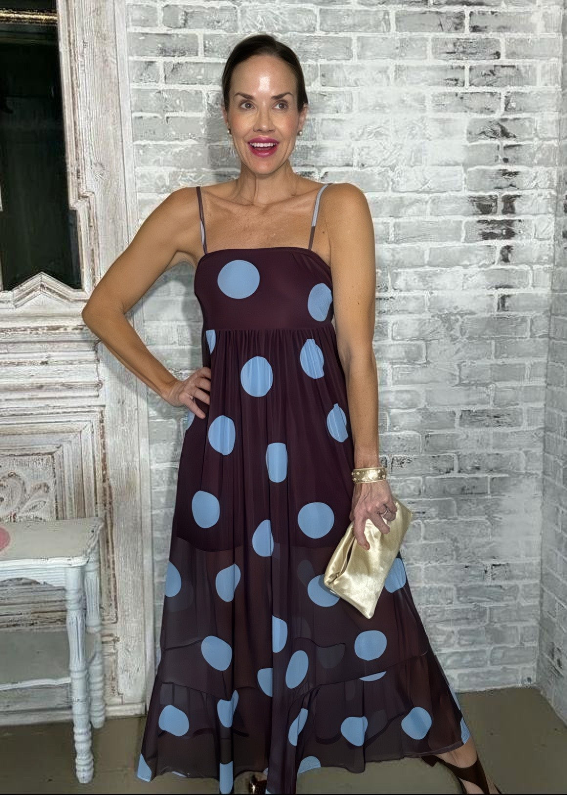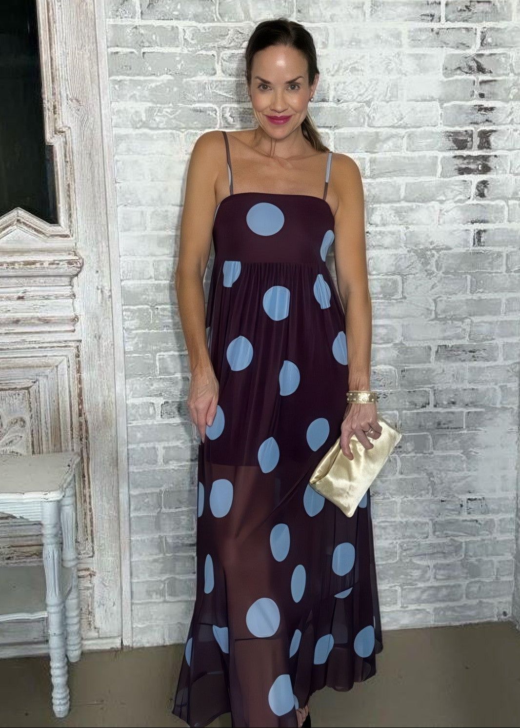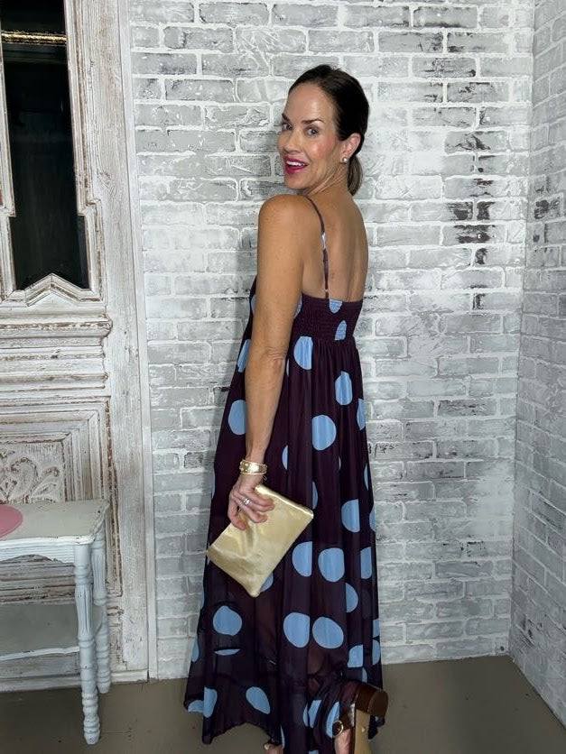 Escape to effortless elegance with this SWEET SPOTLIGHT POLKA DOT MAXI DRESS. The chocolate base with playful blue dots creates a timeless look, while delicate spaghetti straps and a flattering mesh fabric keep you cool and comfortable. Ruching at the back adds subtle dimension, and the lined interior ensures confidence all day long. Perfect for getaways, garden parties, or any occasion calling for understated style.