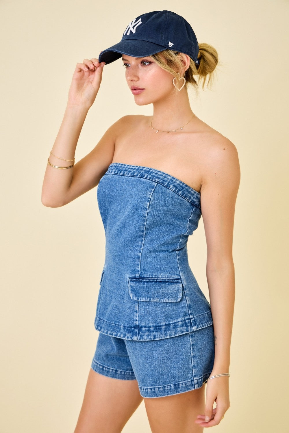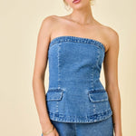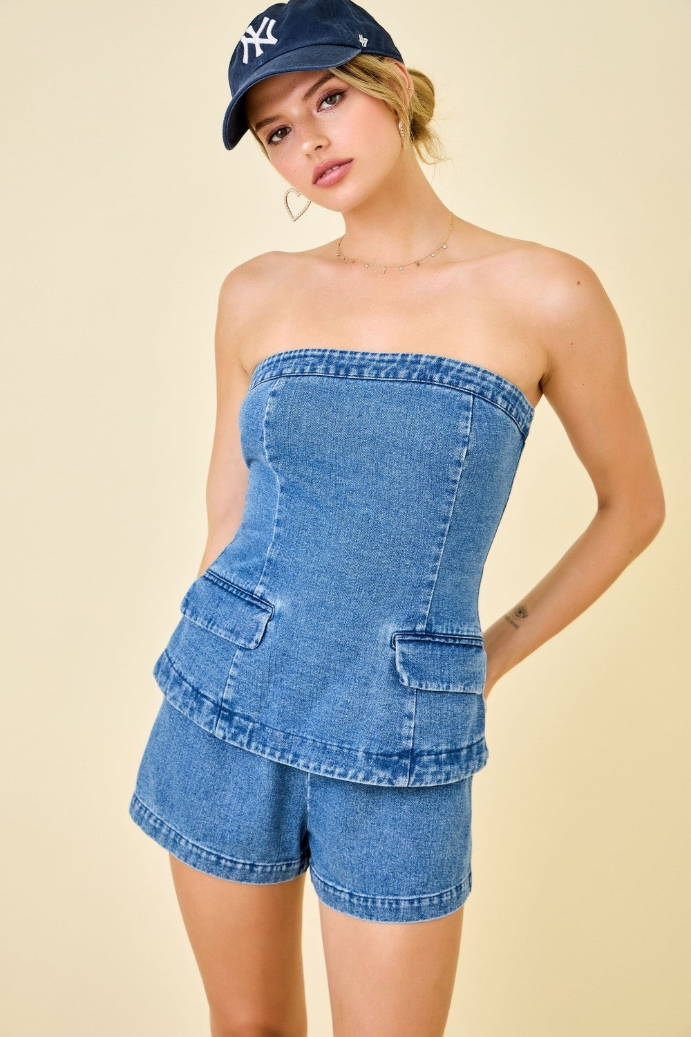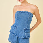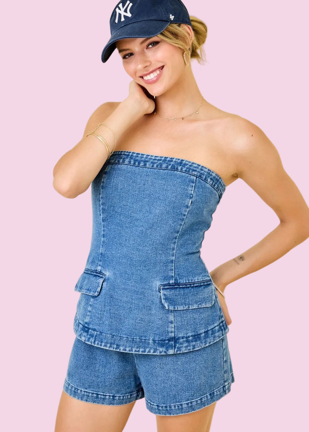 Make a bold statement in this BEYOND THE STAGE STRAPLESS DENIM ROMPER that effortlessly transitions from day to night. The sleek, structured design hugs your curves while functional pockets keep your essentials close. Perfect for music festivals, casual outings, or any occasion where you want to stand out. The timeless denim fabric pairs with the modern strapless silhouette for a look that's both edgy and refined.
