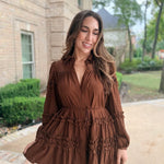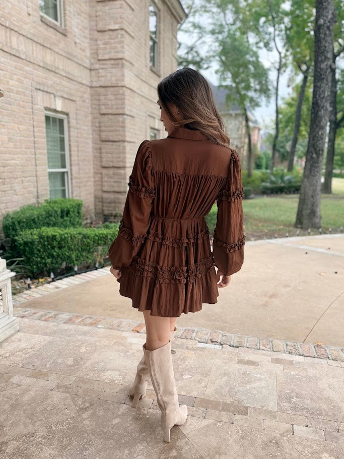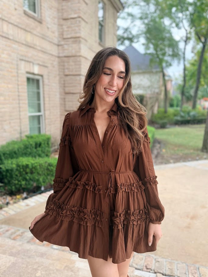 This ALL THE CHARM RUFFLE FLOWY SHIRT DRESS features a button-front designed with soft tiered ruffles that add movement and a romantic touch. The long sleeves, adjustable waist tie, and lightweight fabric create an effortlessly flattering silhouette that's perfect for both everyday wear and weekend outings. This piece blends comfort with boutique-level elegance, making it an easy bestseller for spring and fall assortments. A beautifully detailed dress that photographs exceptionally well and elevates any collection with feminine charm.