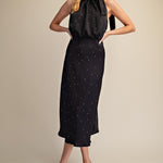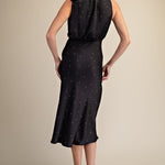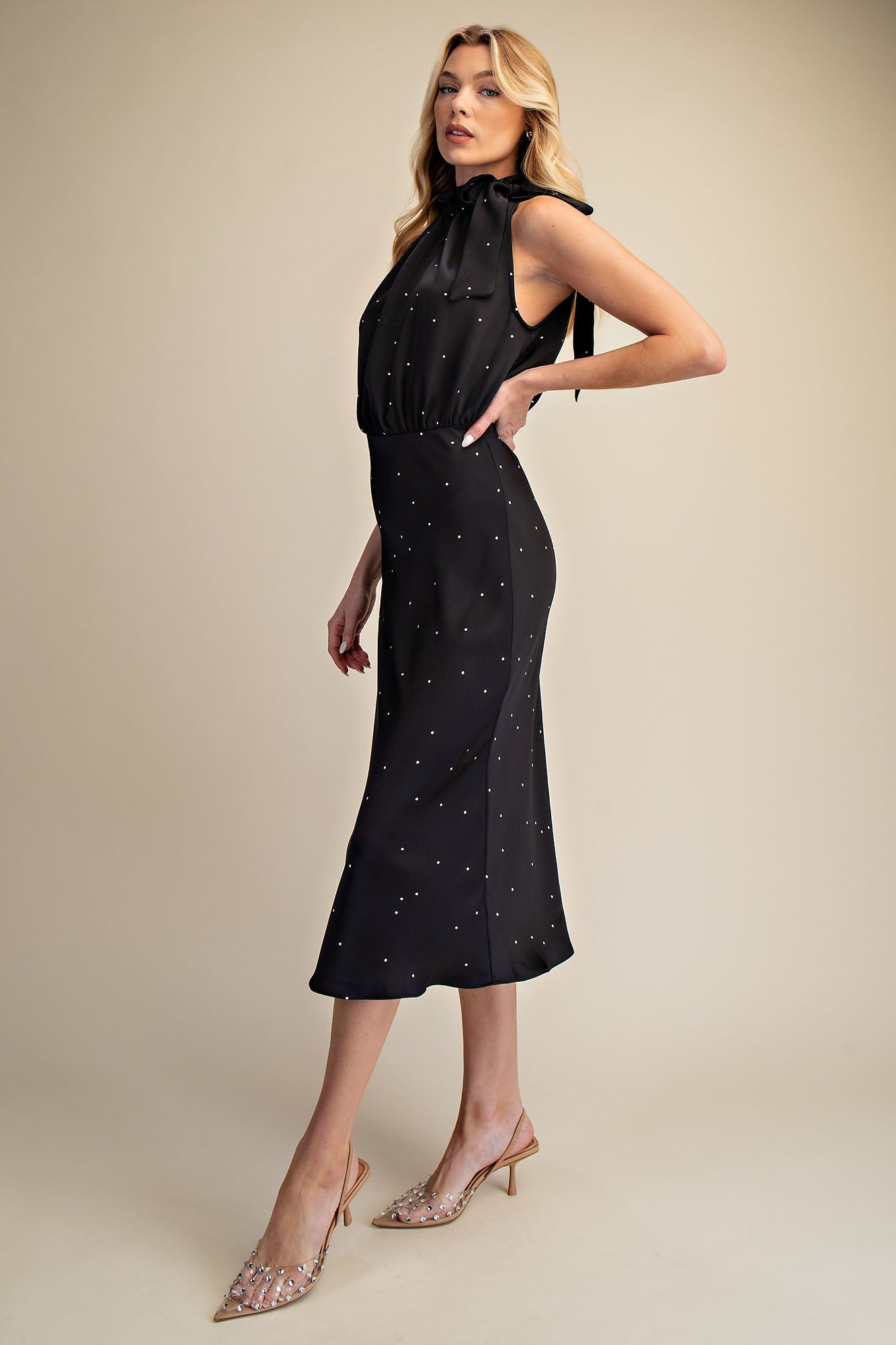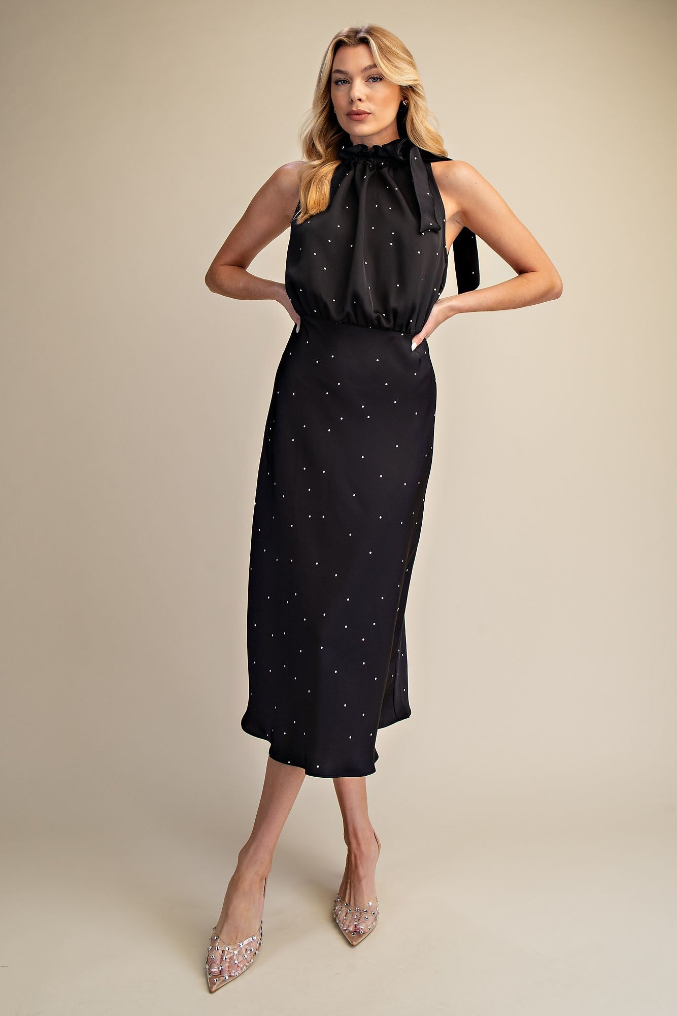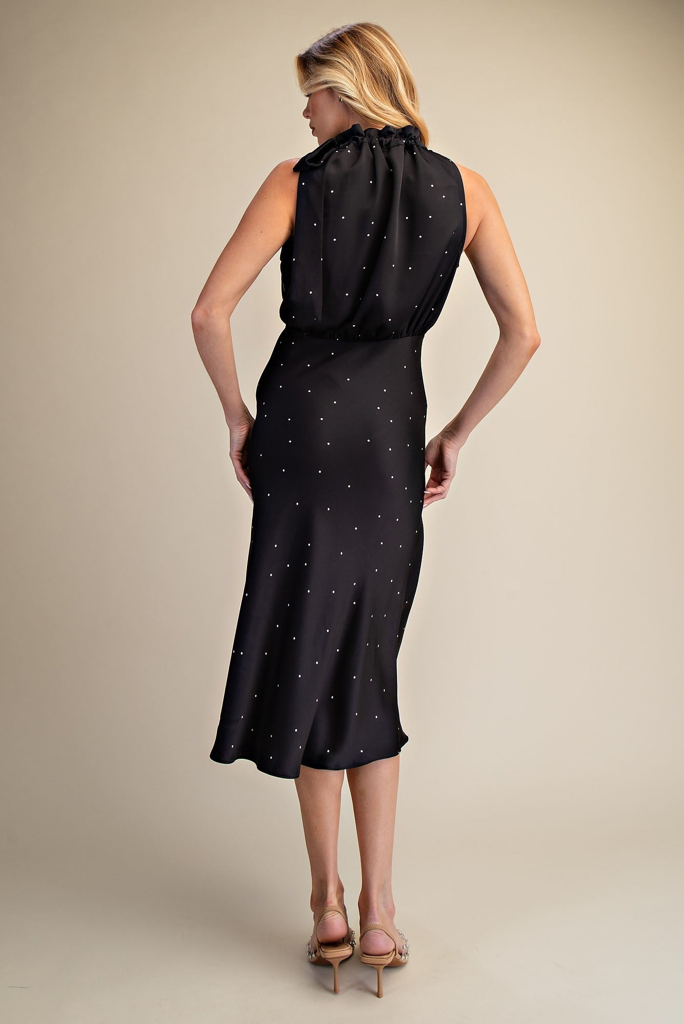 Perfect for special occasions, this GRACEFUL MOMENTS RUFFLE TIE POLKA DOT DRESS combines timeless elegance with playful charm. The sleeveless silhouette features a distinctive ruffle tie neckline that adds movement and sophistication, while classic polka dots bring a touch of vintage-inspired style. The midi length offers a flattering, versatile cut ideal for weddings, bridal showers, garden parties, or any celebration where you want to stand out with grace and confidence.