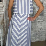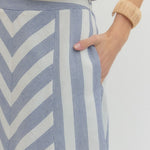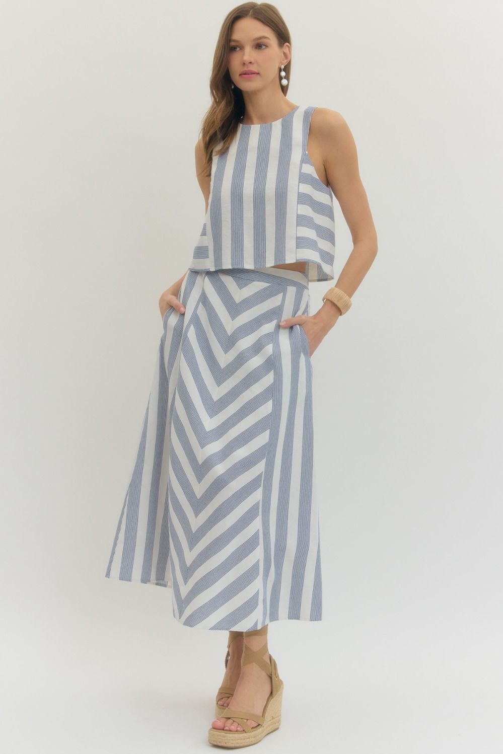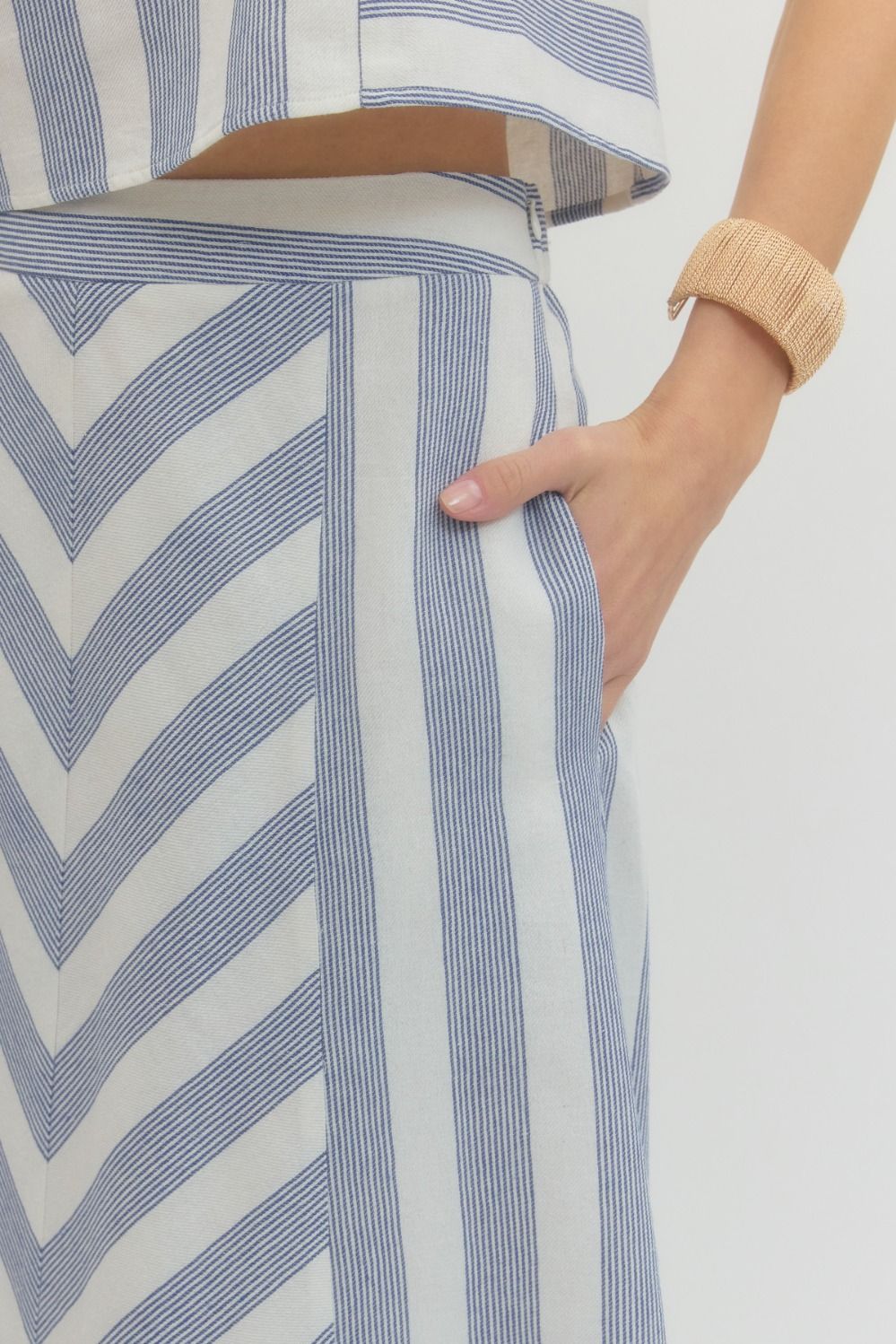 Elevate your everyday style with this EVERYDAY ROMANCE NAVY STRIPE SKIRT, designed for effortless elegance. The chevron stripe pattern adds visual interest, while the elasticated back waistband ensures all-day comfort. A side zipper closure and functional side pockets keep you practical without sacrificing sophistication. Fully lined for a polished finish. Style it with the matching top for a coordinated, put-together look.