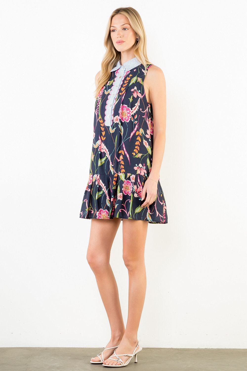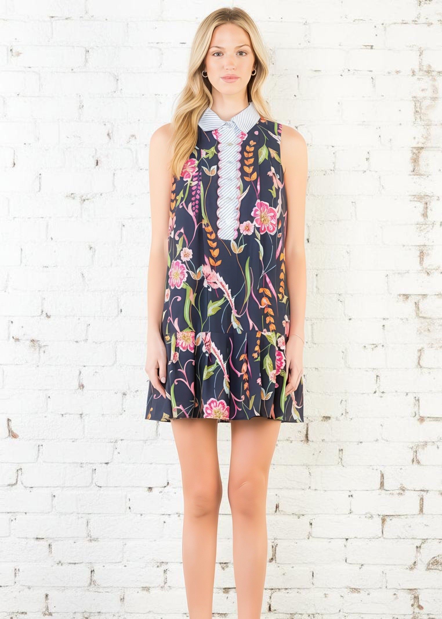 Effortless elegance meets playful charm in this SWEET TALK NAVY FLORAL MINI DRESS. Featuring a crisp collared neckline, navy floral print, and contrasting trim details, it's designed for those who love a polished yet relaxed look. Functional pockets add everyday practicality to this versatile piece—perfect for casual outings or dressed up for a night out.