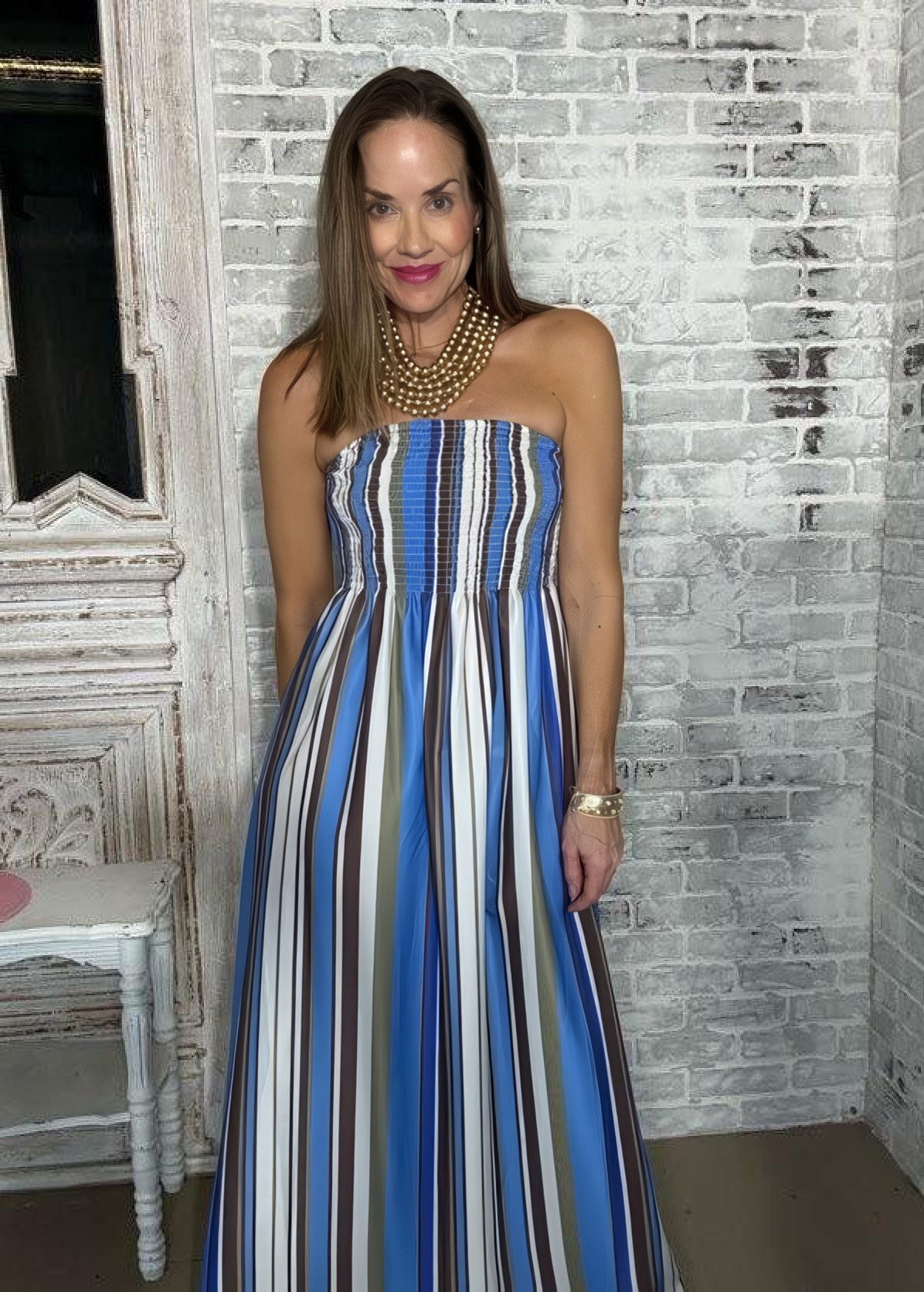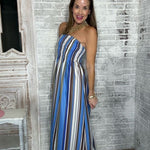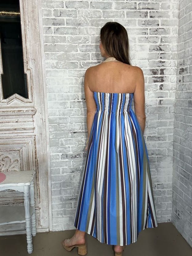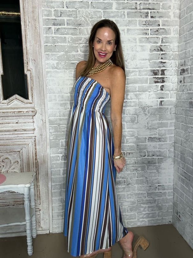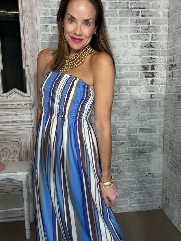 STRIPE AFFAIR STRAPLESS MAXI DRESS