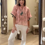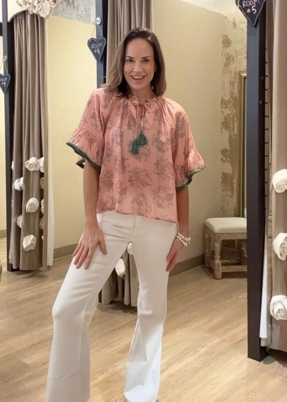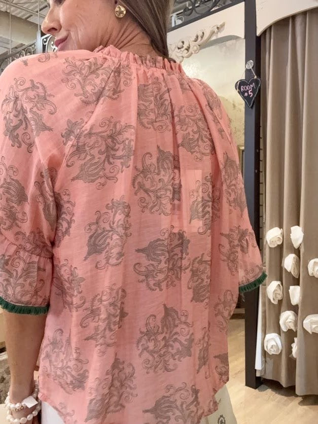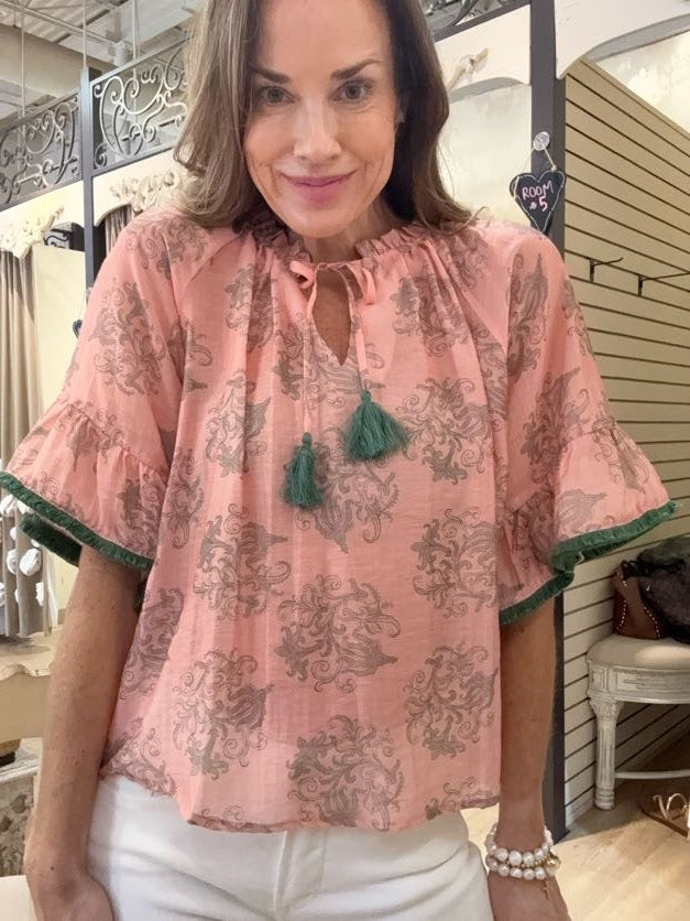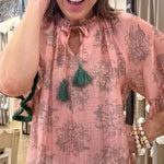 Keep your style sweet with this darling SWEET INTENTIONS PALE PINK TASSLE BLOUSE! Cute fringe and tassel details add playful charm that makes every outfit pop. - Unlined material featuring a green hued ornate print - A v-cut neckline with a tie detail featuring accent tassels - ¾ length sleeves with ruffled cuffs featuring fringe trim - A relaxed silhouette that ends in a straight hem.