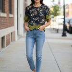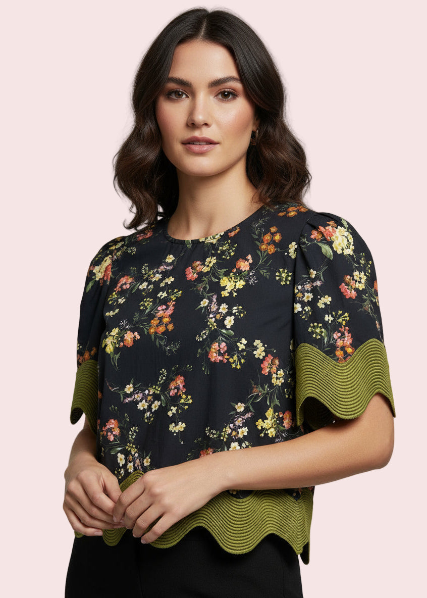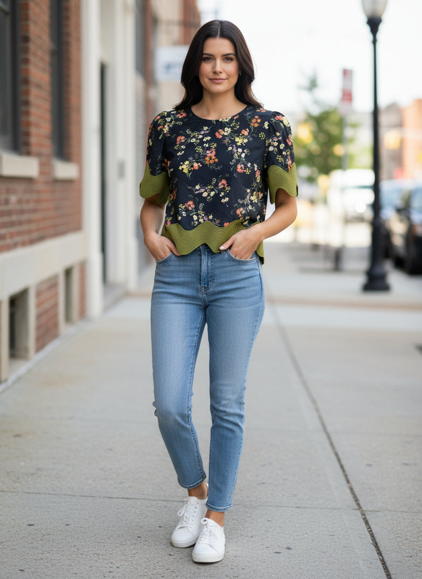 This playful FLORAL ESTATE SCALLOP BLOUSE features a charming floral print with a classic crew neckline. Its standout details include contrasting scalloped edges on the sleeves and hem, adding a fun twist to a slightly cropped fit.