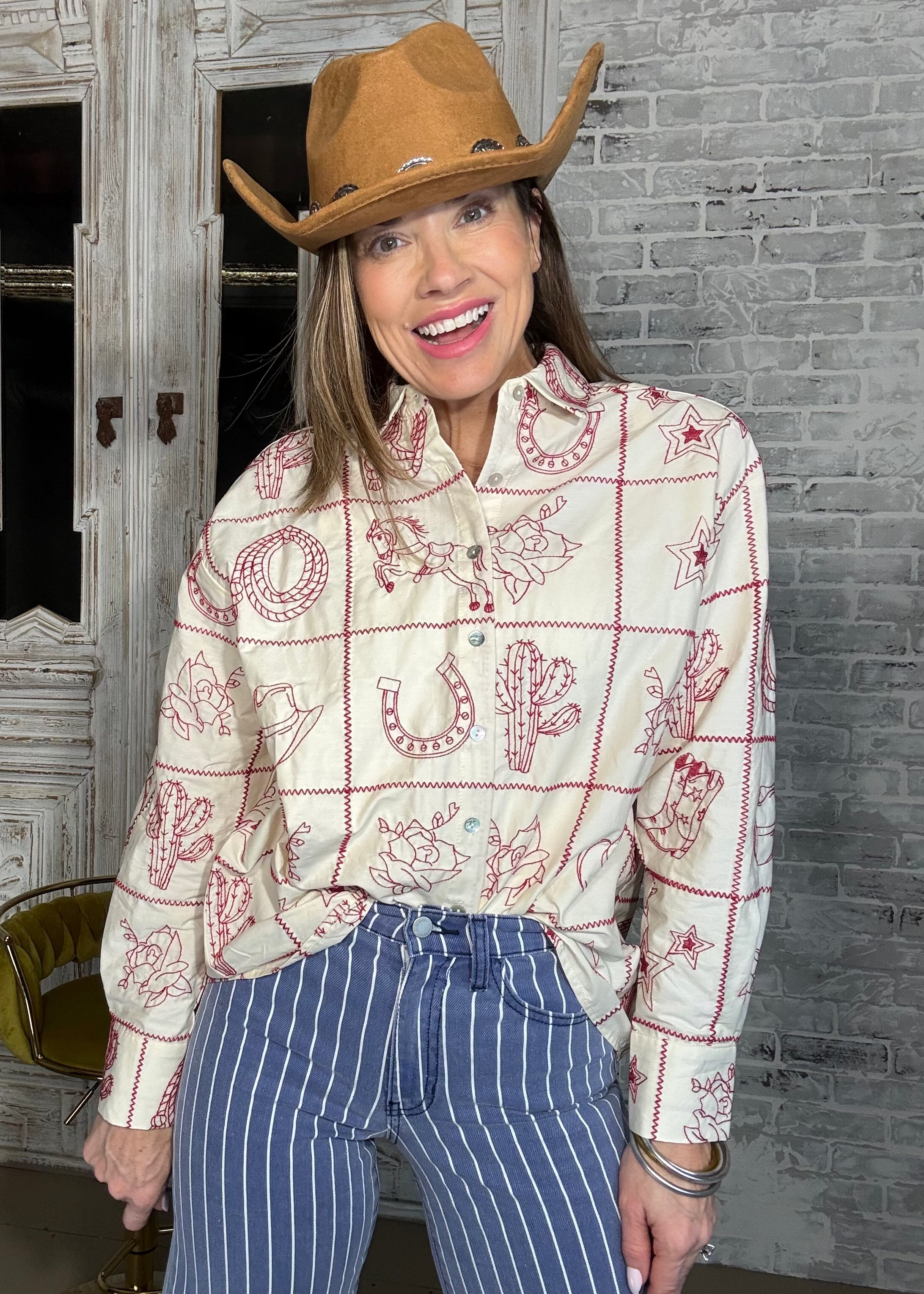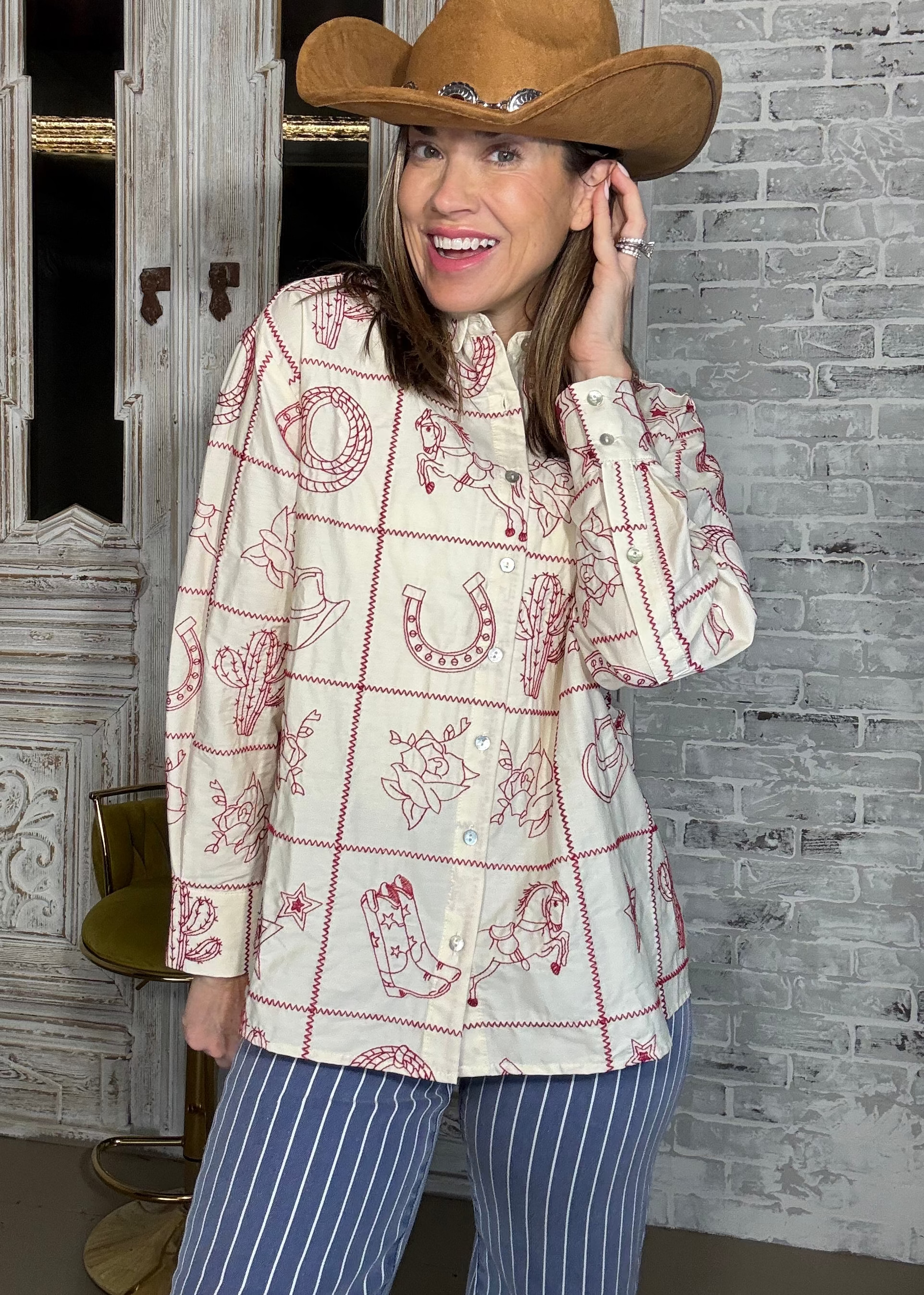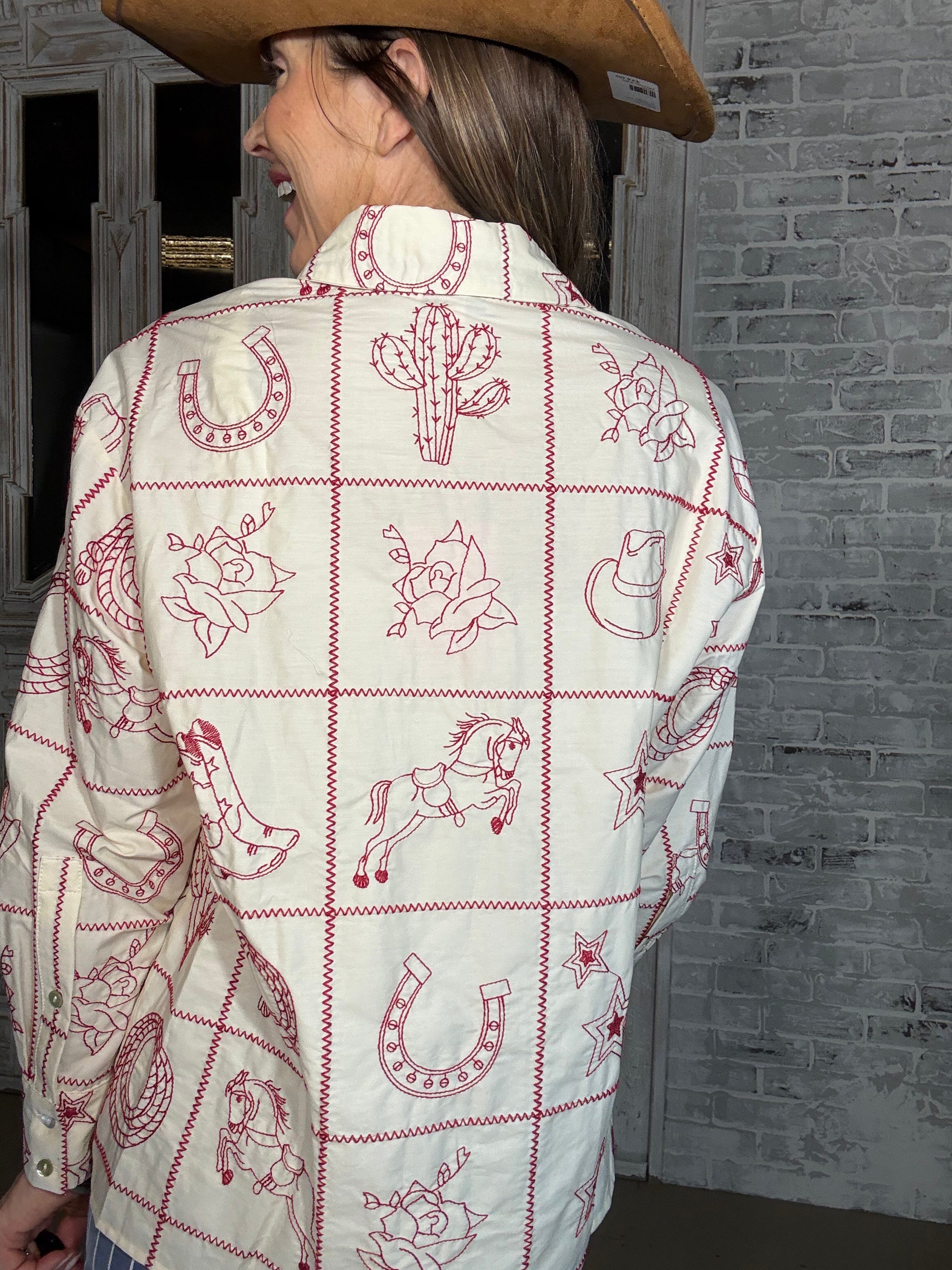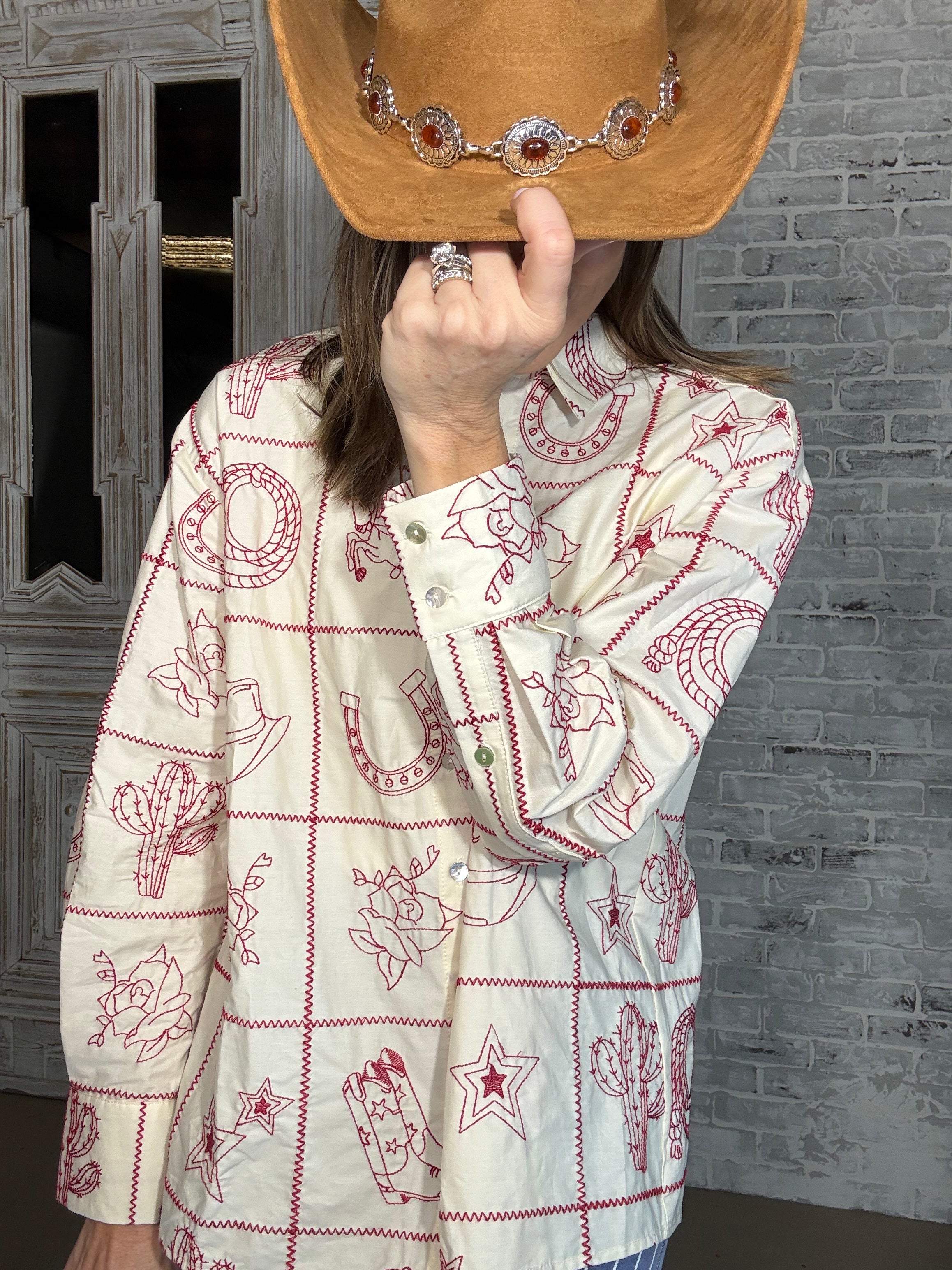 Elevate your western wardrobe with this stunning WESTERN SKIES EMBROIDERED TOP. Crafted in a soft cream hue with eye-catching red embroidery, this button-down style delivers authentic western chic appeal. The versatile design works beautifully tucked in or worn loose for effortless styling. Perfect for ranch days, country nights, or anyone who loves classic western flair.