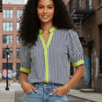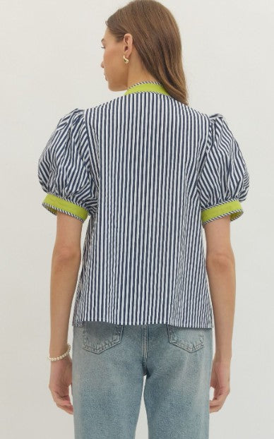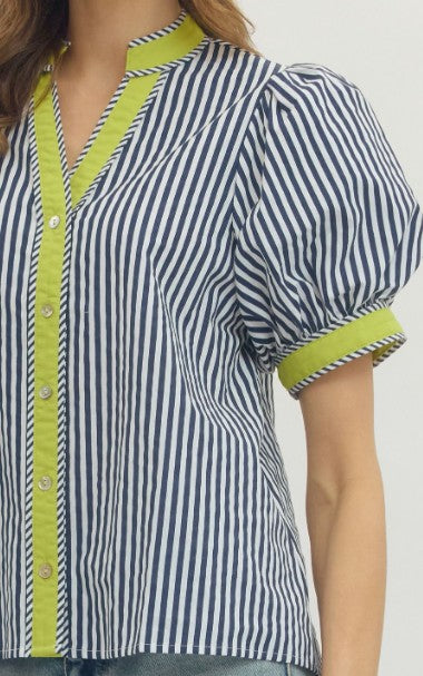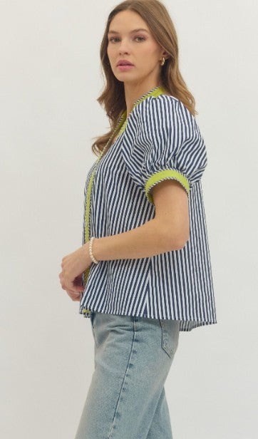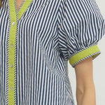 Effortless coastal style meets everyday comfort in this BEACHSIDE BRUNCH NAVY STRIPE TOP. The flattering V-neckline with contrast binding pairs beautifully with short puff sleeves for a breezy, feminine silhouette. Front button closure and soft cotton construction make it perfect for warm-weather dressing, whether you're heading to brunch or running errands.