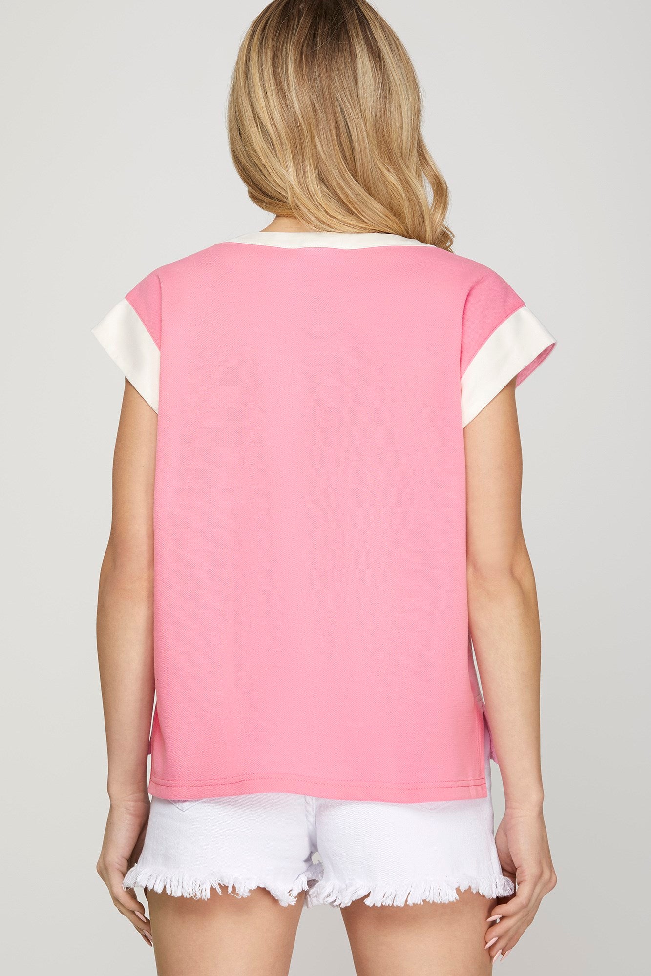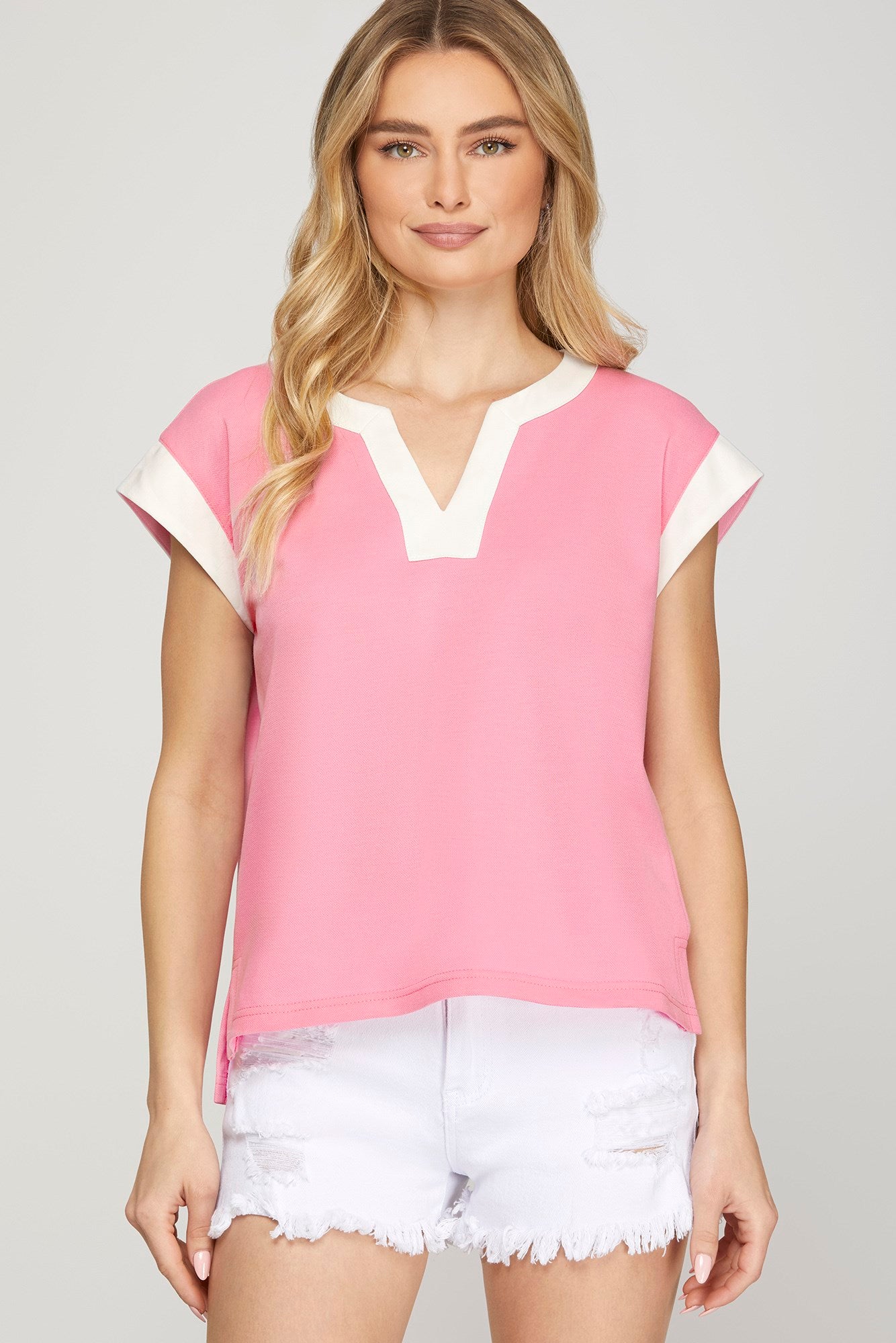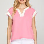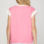 Brighten your warm-weather wardrobe with this charming FUN IN THE SUN CANDY PINK TOP featuring relaxed drop shoulders with contrasting white trim. The contrast detailing adds visual interest to this effortless piece, perfect for pairing with matching shorts for a coordinated, playful look. Ideal for casual outings and sunny days ahead.