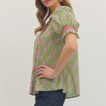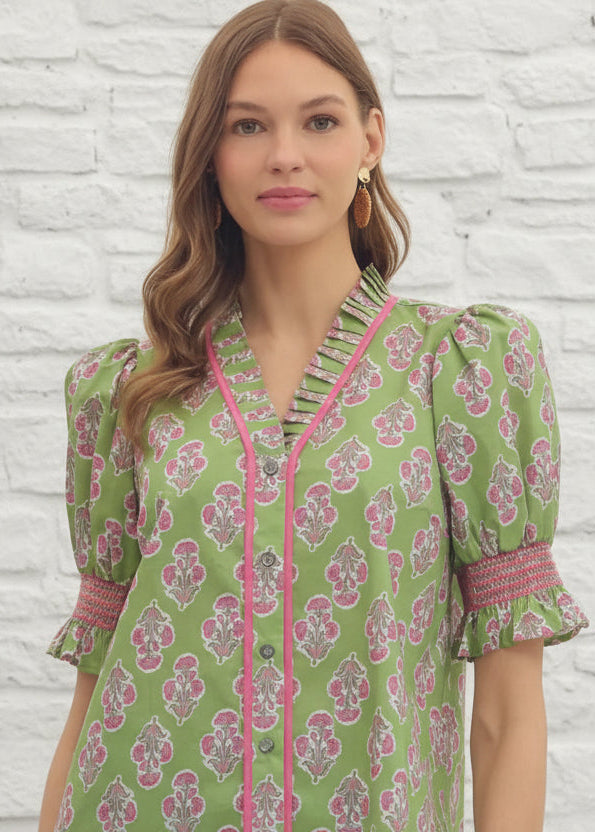 Escape into nature's beauty with this DREAMING OF FLORALS COTTON TOP. Bold floral prints dance across soft fabric, while puff sleeves and a ruffled stand collar add romantic flair. The smocked cuff details and front button closure create effortless elegance, perfect for spring days or casual outings. Contrast binding frames the design for a polished finish.