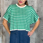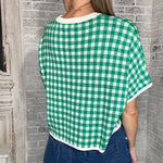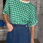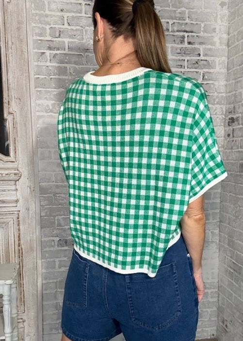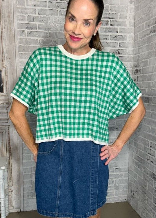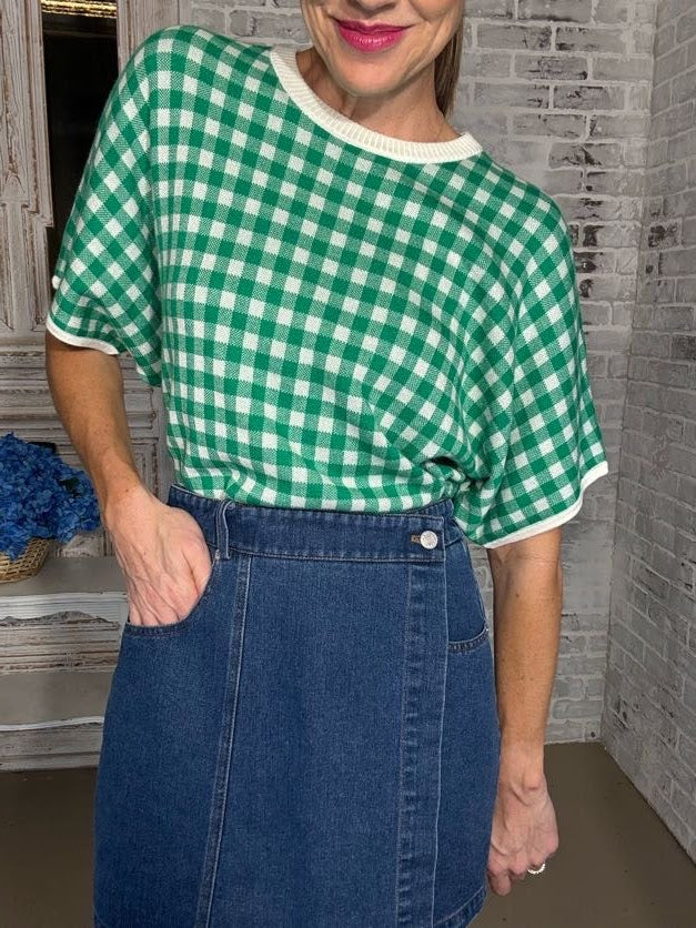Elevate your spring wardrobe with this CHECKERED CHARM GREEN SWEATER TOP. The classic checkered pattern brings timeless appeal, while the crew neck and relaxed batwing short sleeves offer effortless comfort and style. Perfect for layering or wearing solo, this piece transitions seamlessly from casual days to weekend outings. A versatile essential that pairs beautifully with denim, skirts, or tailored trousers.
