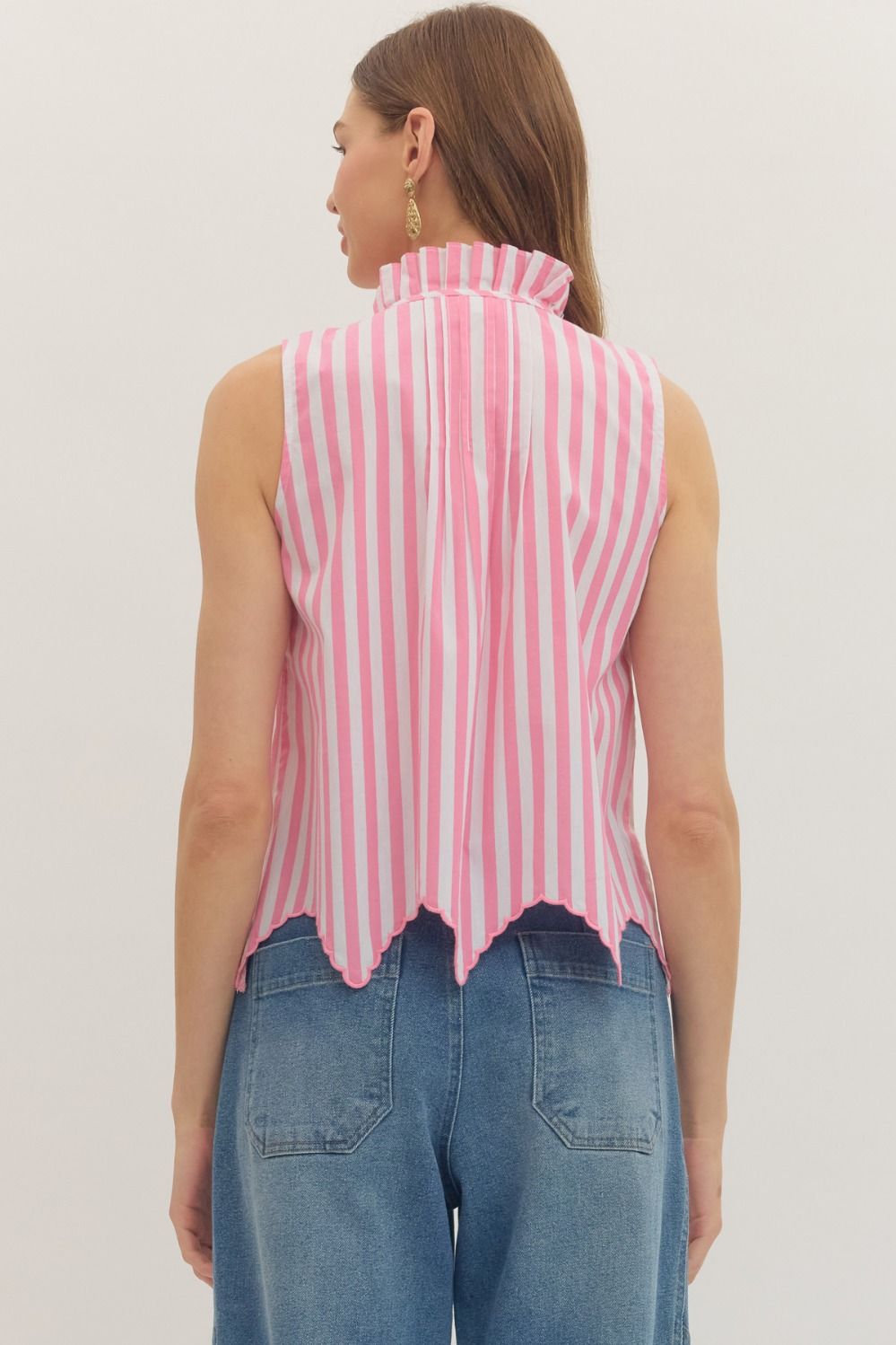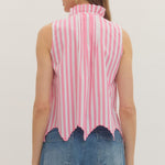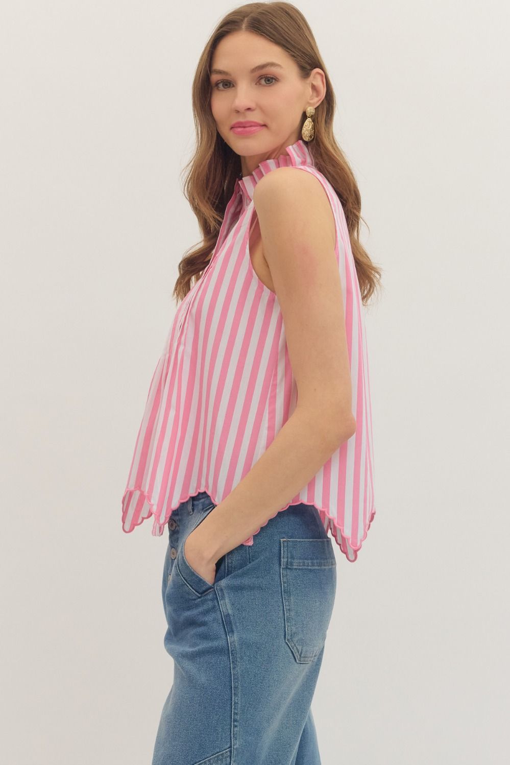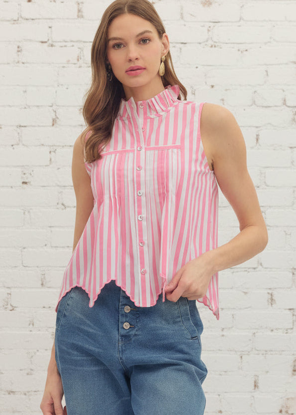 Brighten your summer wardrobe with this charming PRETTY IN PINK STRIPED TOP. The classic pink and white stripes bring a fresh, cheerful vibe perfect for warm-weather days. Designed with a flattering scallop hem and convenient button-down front, it's an easy layering piece that pairs beautifully with shorts, skirts, or linen pants. Ideal for casual outings, beach trips, or relaxed weekend gatherings.