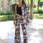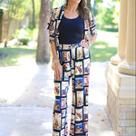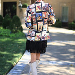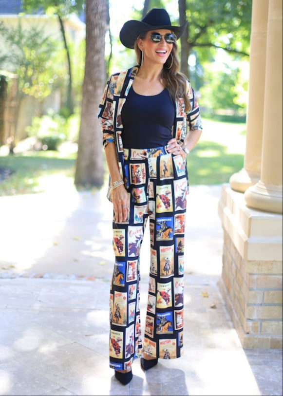 This RODEO BOUND WESTERN COWBOY GRAPHIC PRINT BLAZER offers long sleeves, a trendy roll collar, and handy front pockets, all adorned with eye-catching Western cowboy stamp designs. Match it perfectly with the coordinating pants for a complete look.