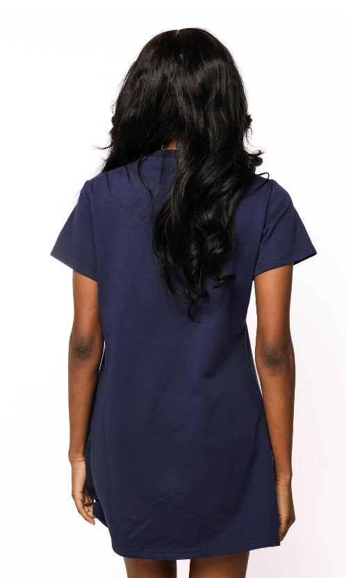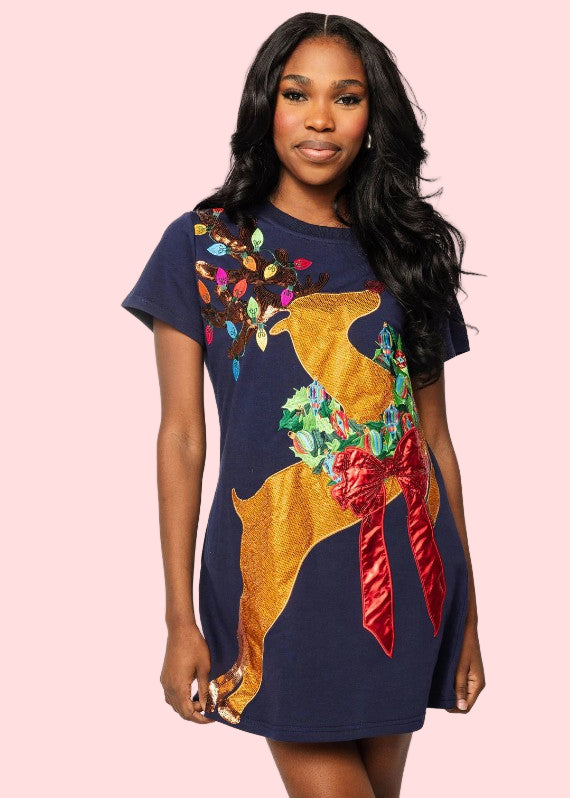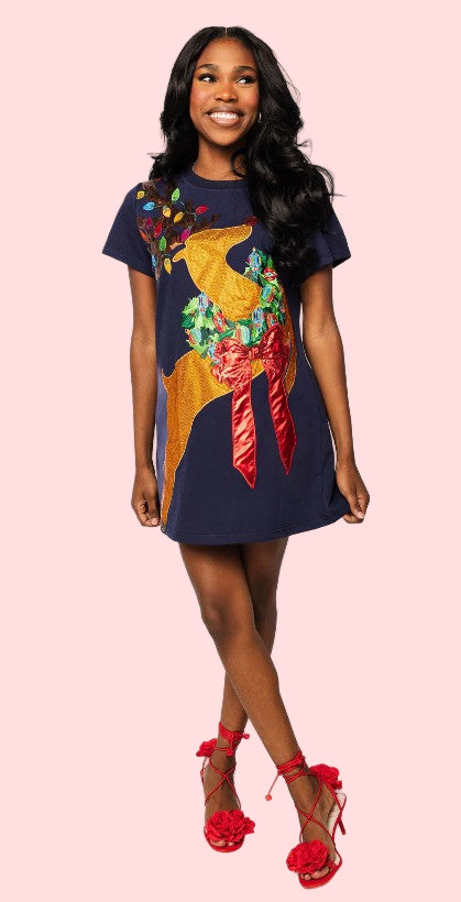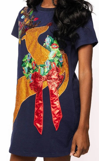 Celebrate the season in style with this Navy Rhinestone Rudolph Wearing A Wreath Tee Dress. Featuring a charming rhinestone-studded Rudolph sporting a festive wreath, this playful dress adds holiday cheer to your wardrobe. Its comfortable tee dress fit makes it perfect for festive gatherings, while the sparkling details catch every eye. Embrace fun and comfort this holiday with a look that's as jolly as Rudolph himself!