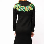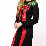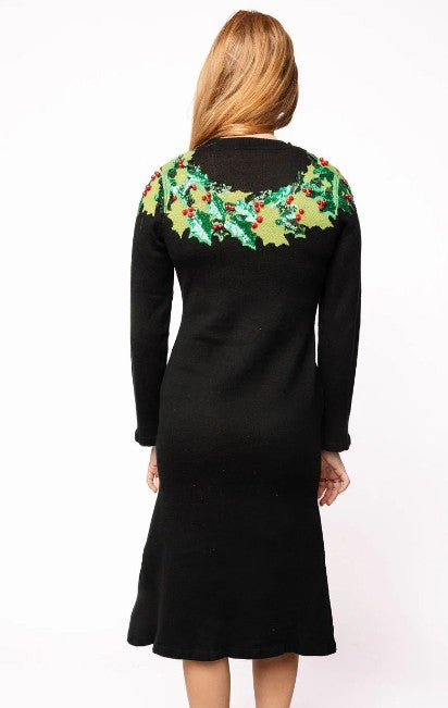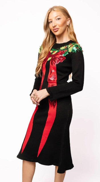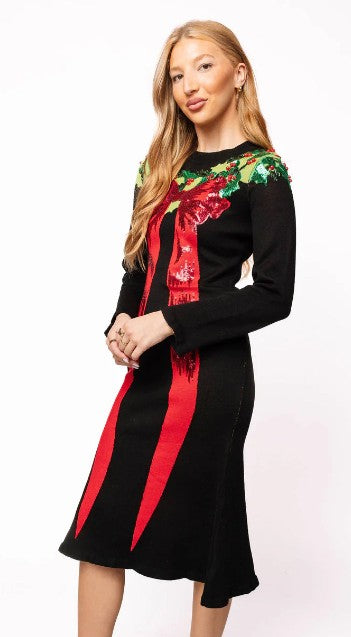 Get ready to shine at every holiday gathering in this playful black midi sweater dress! Featuring a festive wreath design that elegantly wraps around the shoulders and a bold statement bow cascading down the front, this knit dress blends cozy comfort with standout style. Perfect for Christmas parties, it’s your go-to for spreading cheer with a touch of sparkle.