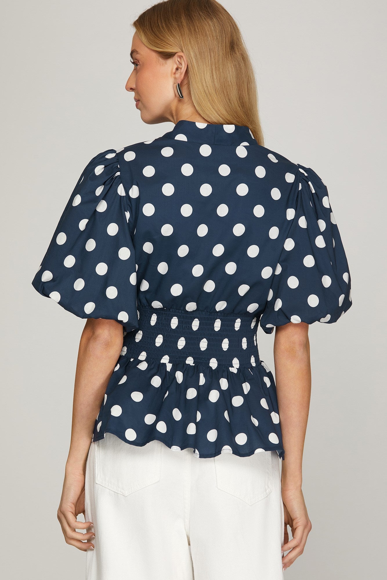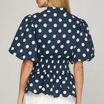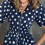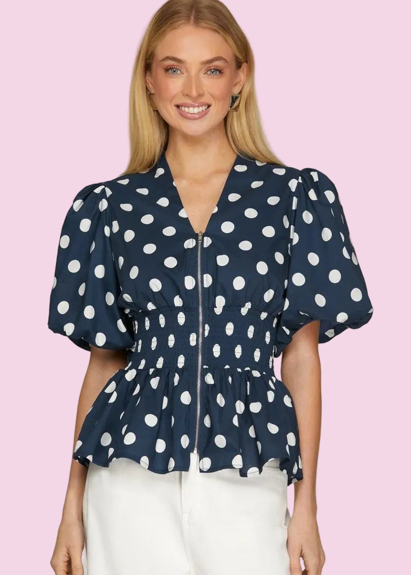Spot the style with this TAKE IN THE SIGHTS NAVY ZIP FRONT POLKA DOT BLOUSE featuring a playful polka dot pattern that's impossible to miss. The front zip closure makes getting dressed a breeze, while puffed sleeves add a touch of whimsy to your everyday look. Cinched waist smocking creates a flattering silhouette that's both comfy and chic. Perfect for anyone who loves mixing fun prints with timeless sophistication.
