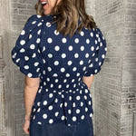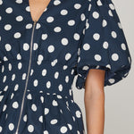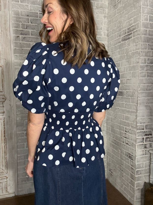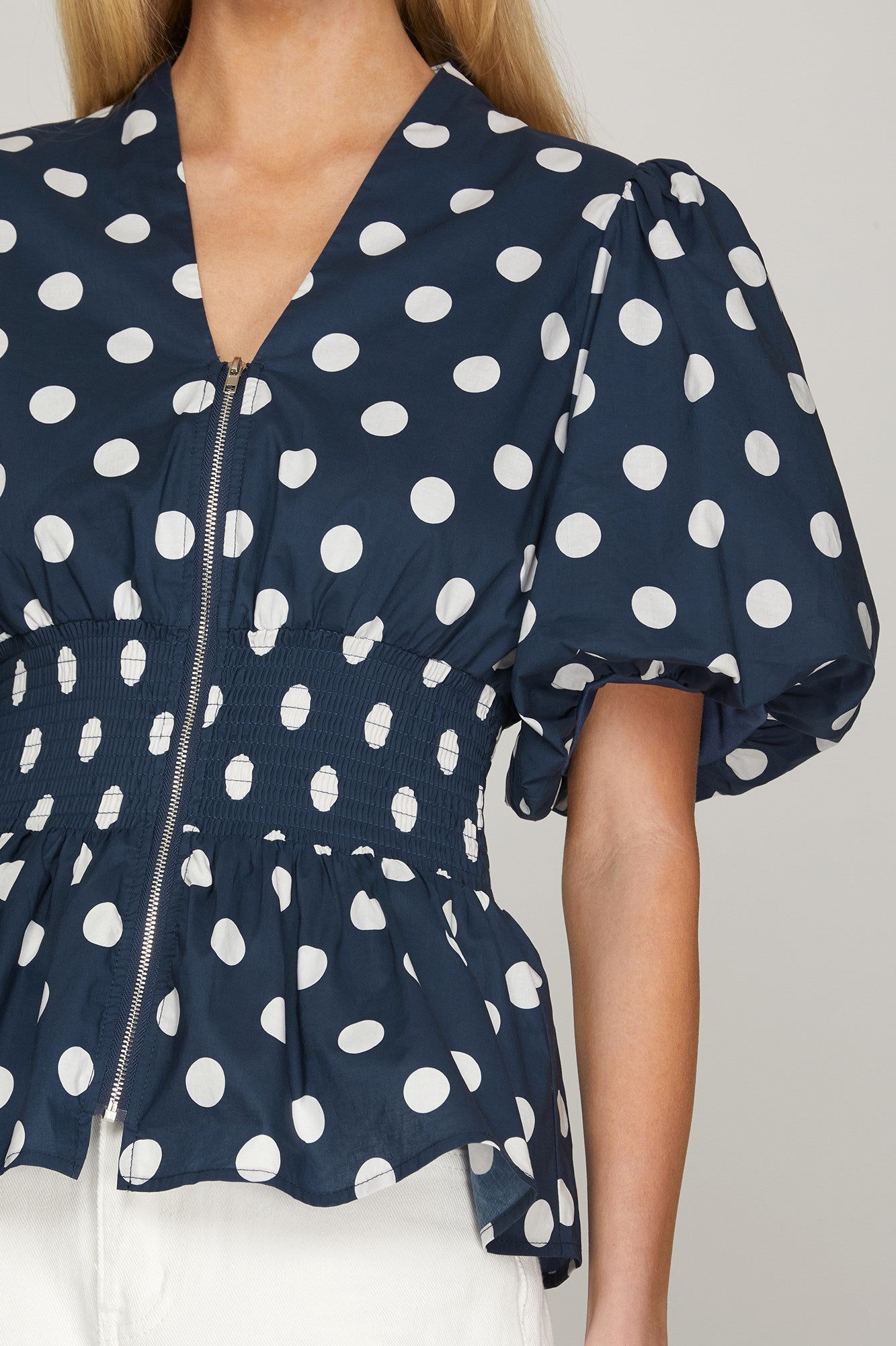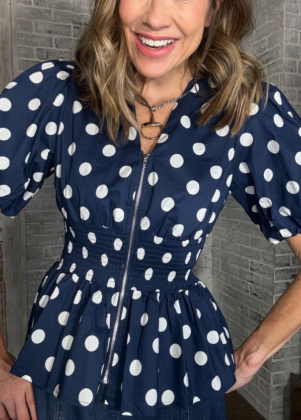 TAKE IN THE SIGHTS NAVY ZIP FRONT POLKA DOT BLOUSE